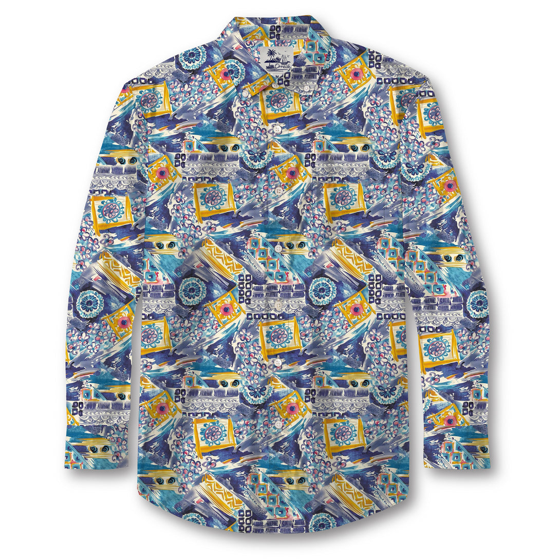 This shirt features a lively, collage-like print blending abstract brush strokes with geometric motifs. The design combines hand-painted elements in deep blue and indigo tones with accents of golden yellow and bright coral. Circular mandala-inspired medallions, framed square panels, and scattered floral touches create a layered effect reminiscent of Mediterranean tiles and artistic mosaics. The overall look is dynamic and expressive, with a balance of structured shapes and free-flowing painterly textures.