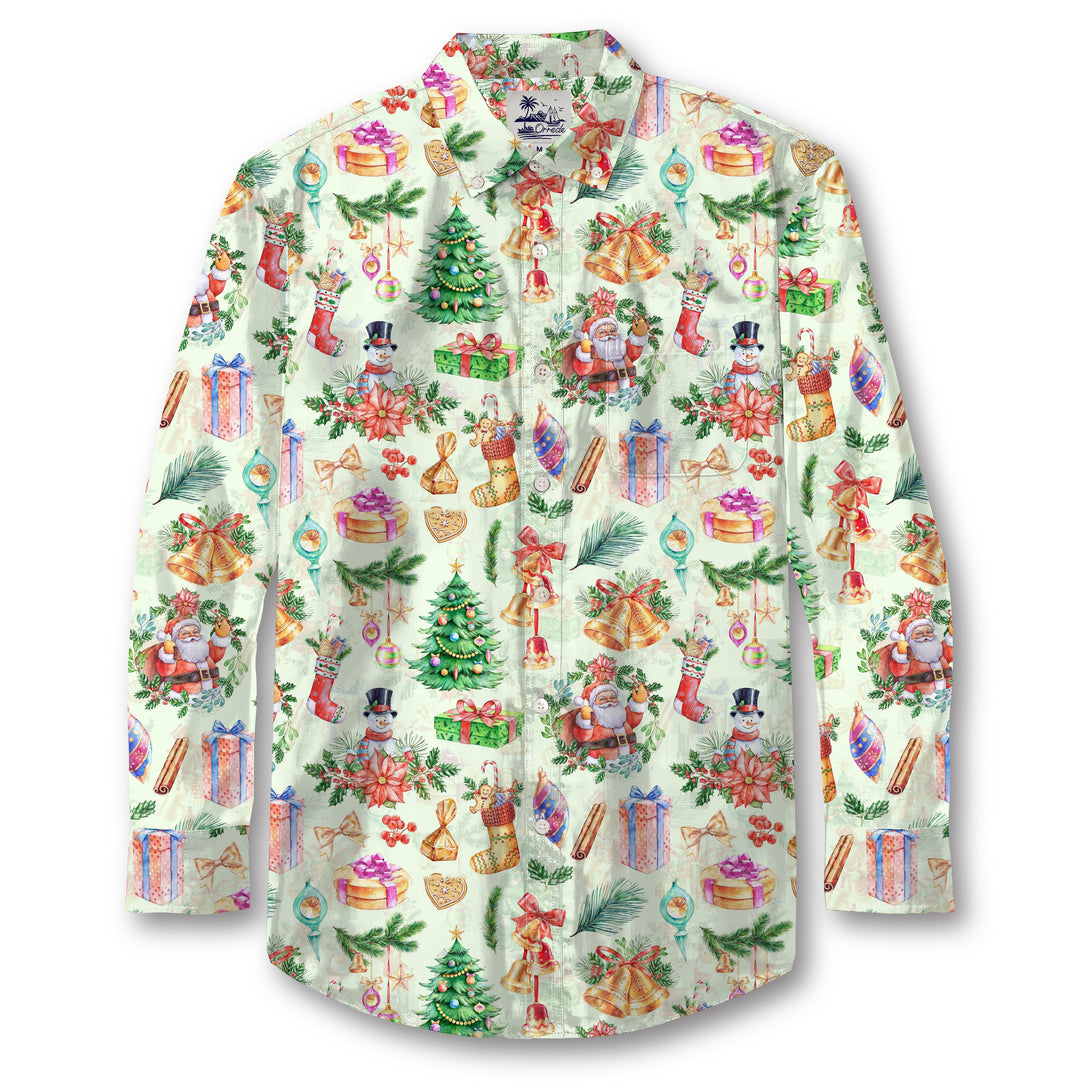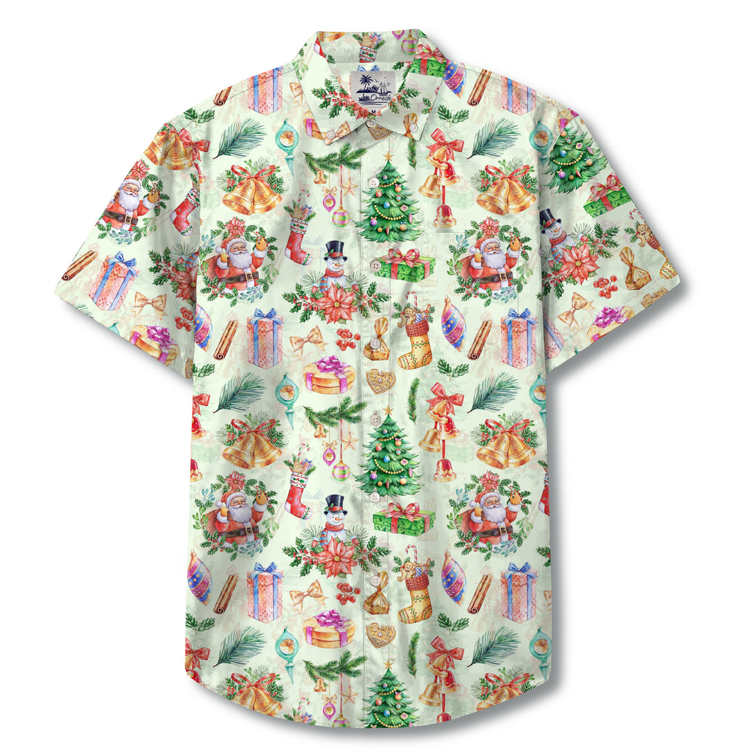 This shirt design bursts with festive holiday cheer, featuring a vibrant watercolor collage of Christmas icons. The print includes decorated Christmas trees, Santa Claus, snowmen, golden bells tied with red bows, wrapped presents, stockings, poinsettias, and ornaments, all set against a light background. The arrangement captures the joyful spirit of Christmas with playful detail, making it a perfect choice for holiday gatherings.