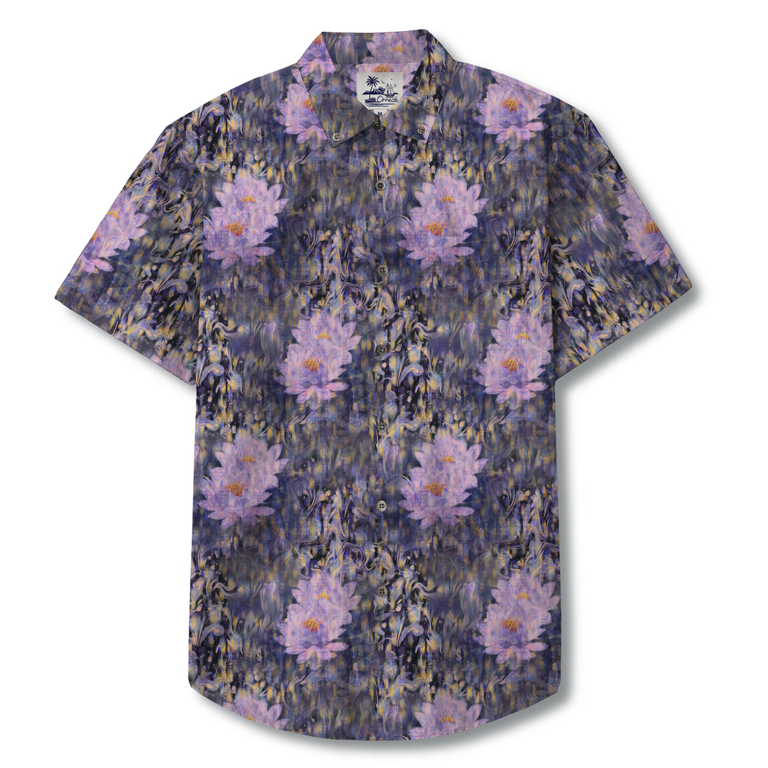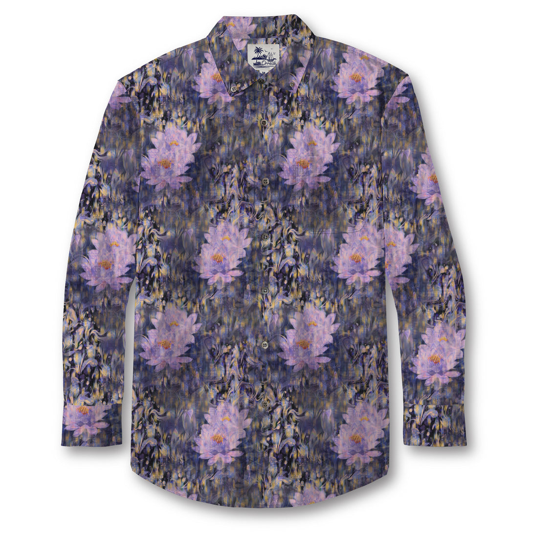 This design showcases a dreamlike field of large, soft lavender blossoms emerging from a deep, midnight-toned background. The petals appear to glow gently, with hints of pink and lilac blending into swirling strokes of navy, charcoal, and muted gold. The overall effect is painterly and atmospheric—almost like flowers drifting through a moonlit haze. The pattern feels elegant, mysterious, and subtly luxurious, perfect for someone who enjoys refined artistry with a touch of fantasy.