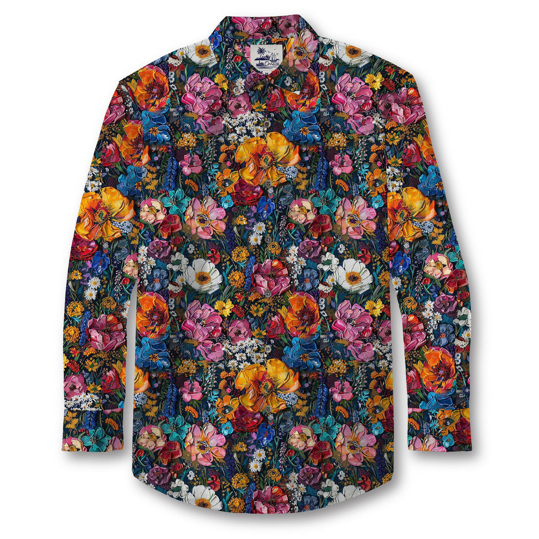 A vivid explosion of florals unfurls across a deep navy background, creating a dramatic yet romantic visual tapestry. The shirt features a lush mix of blossoms—roses, poppies, peonies, and wildflowers—in vibrant hues of magenta, orange, golden yellow, cobalt blue, and crimson. Delicate white flowers and leafy greens add depth and balance, giving the pattern a painterly richness. The intricate design evokes the feeling of a midnight garden in full bloom—wild, opulent, and alive with color.