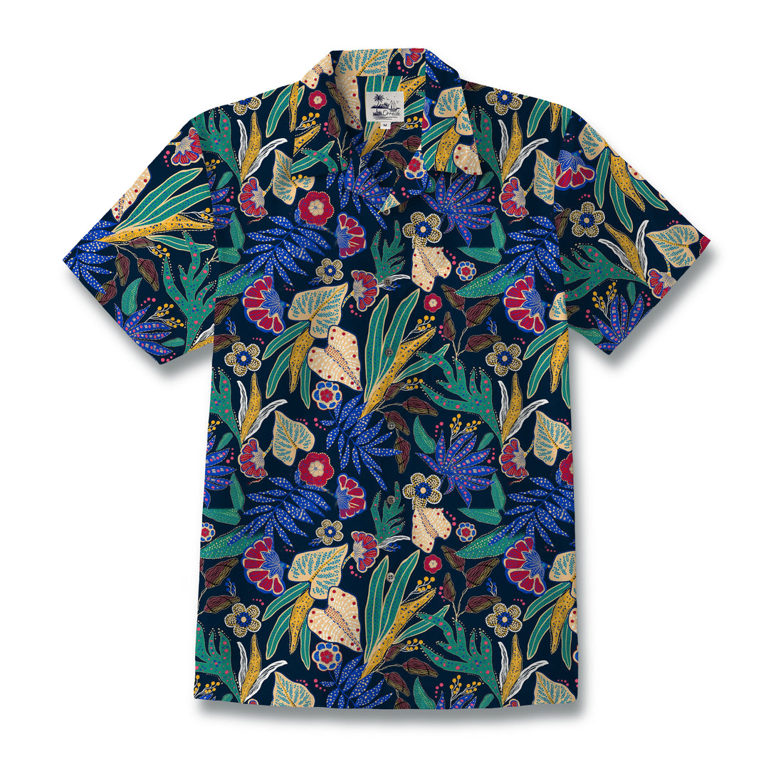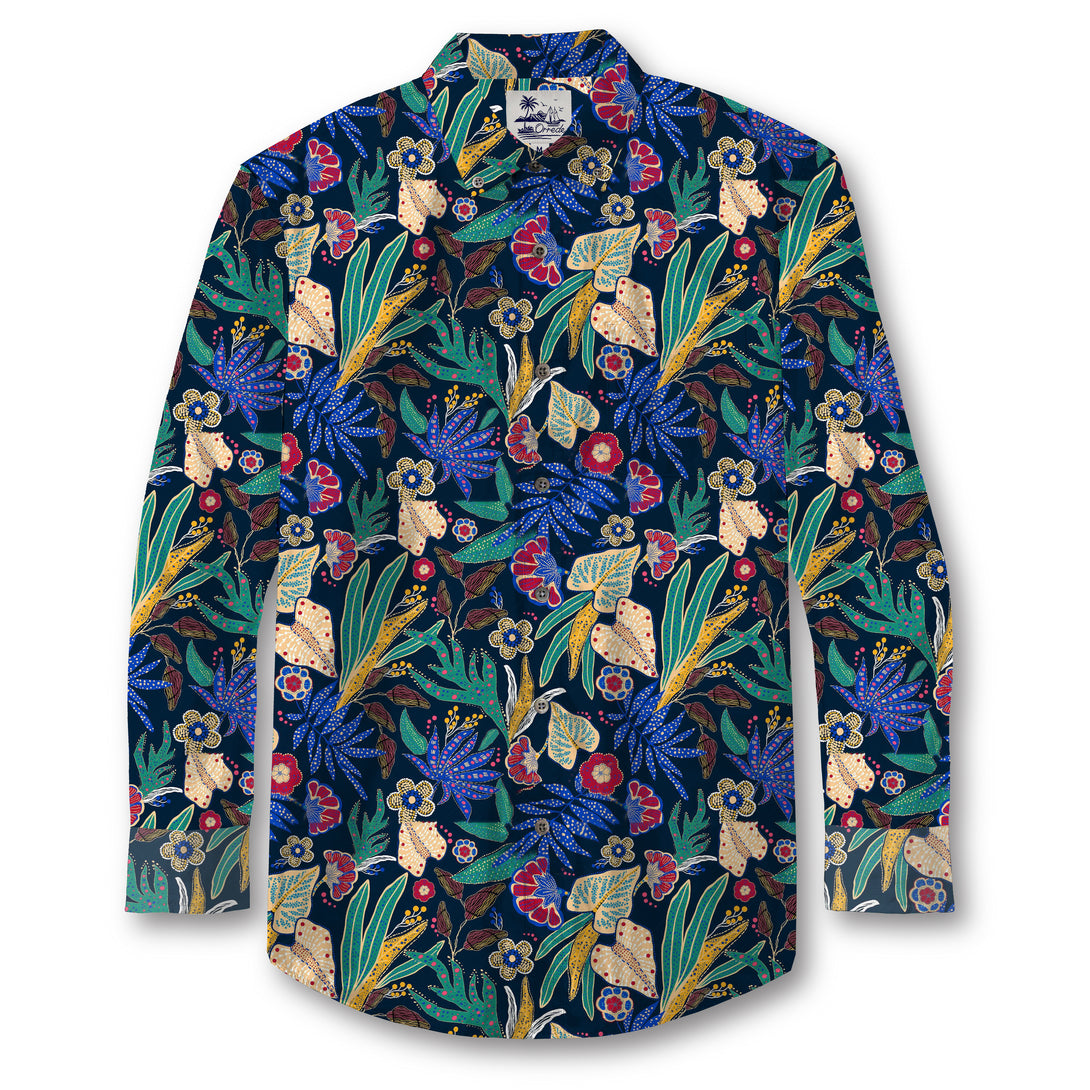 A vivid nocturnal garden comes alive on deep navy fabric. Midnight Botanic features an intricate array of tropical leaves and blossoms in hues of emerald green, cobalt blue, mustard yellow, and crimson red. Each element is delicately dotted and textured, creating a hand-painted effect that evokes the mystery and richness of nature after dusk. The harmonious blend of bold colors and organic shapes brings both sophistication and liveliness to this striking design.