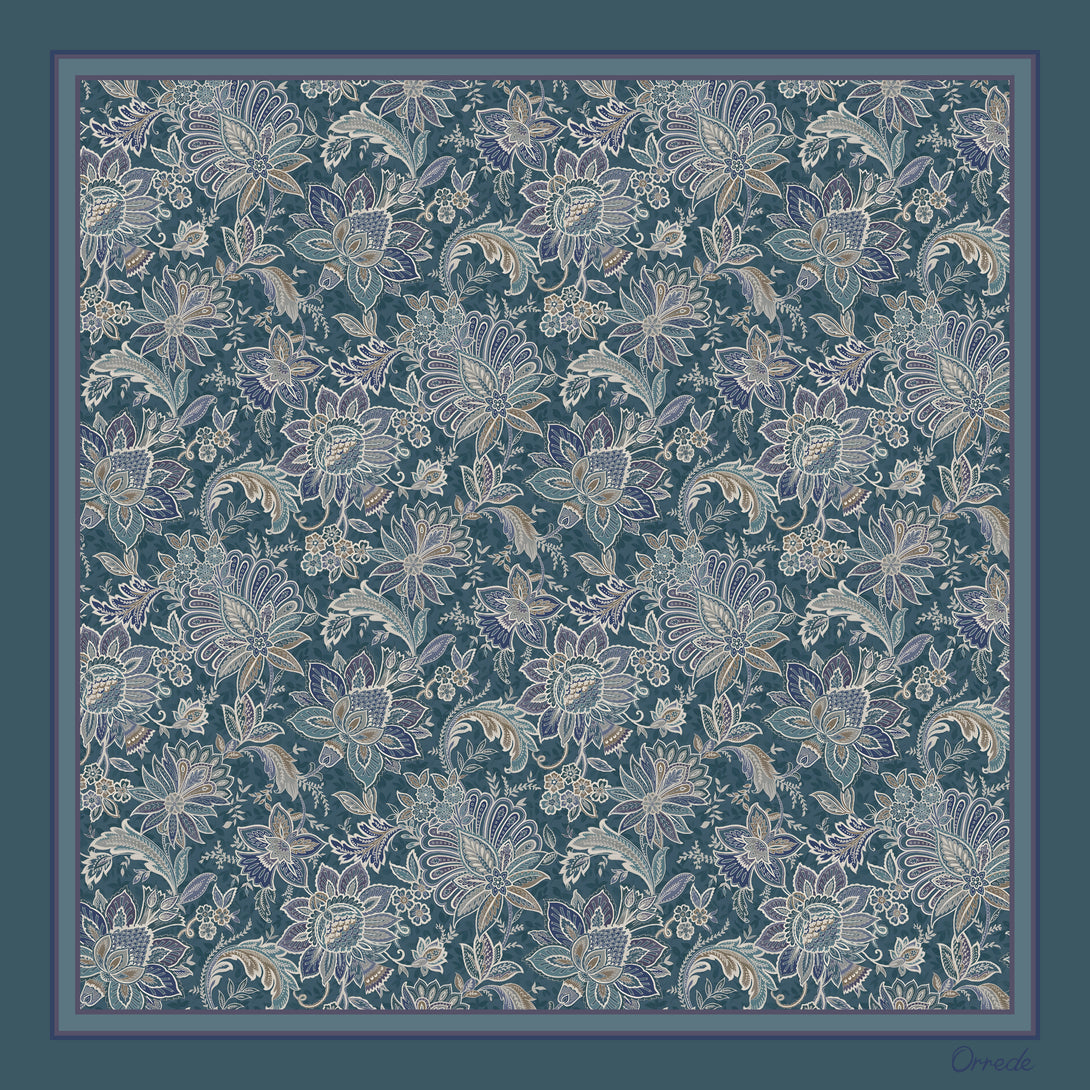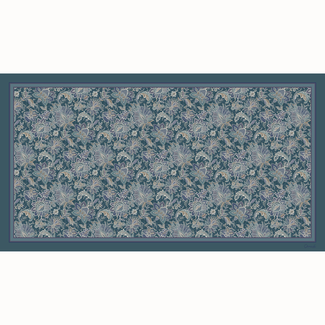 This design features an intricate arrangement of blooming florals with delicate leaves and paisley-inspired swirls. Set against a deep teal background, the muted tones of beige, soft lavender, and hints of ivory create a sophisticated, vintage feel. The pattern flows harmoniously, evoking a sense of calm elegance—like a moonlit garden in full bloom.