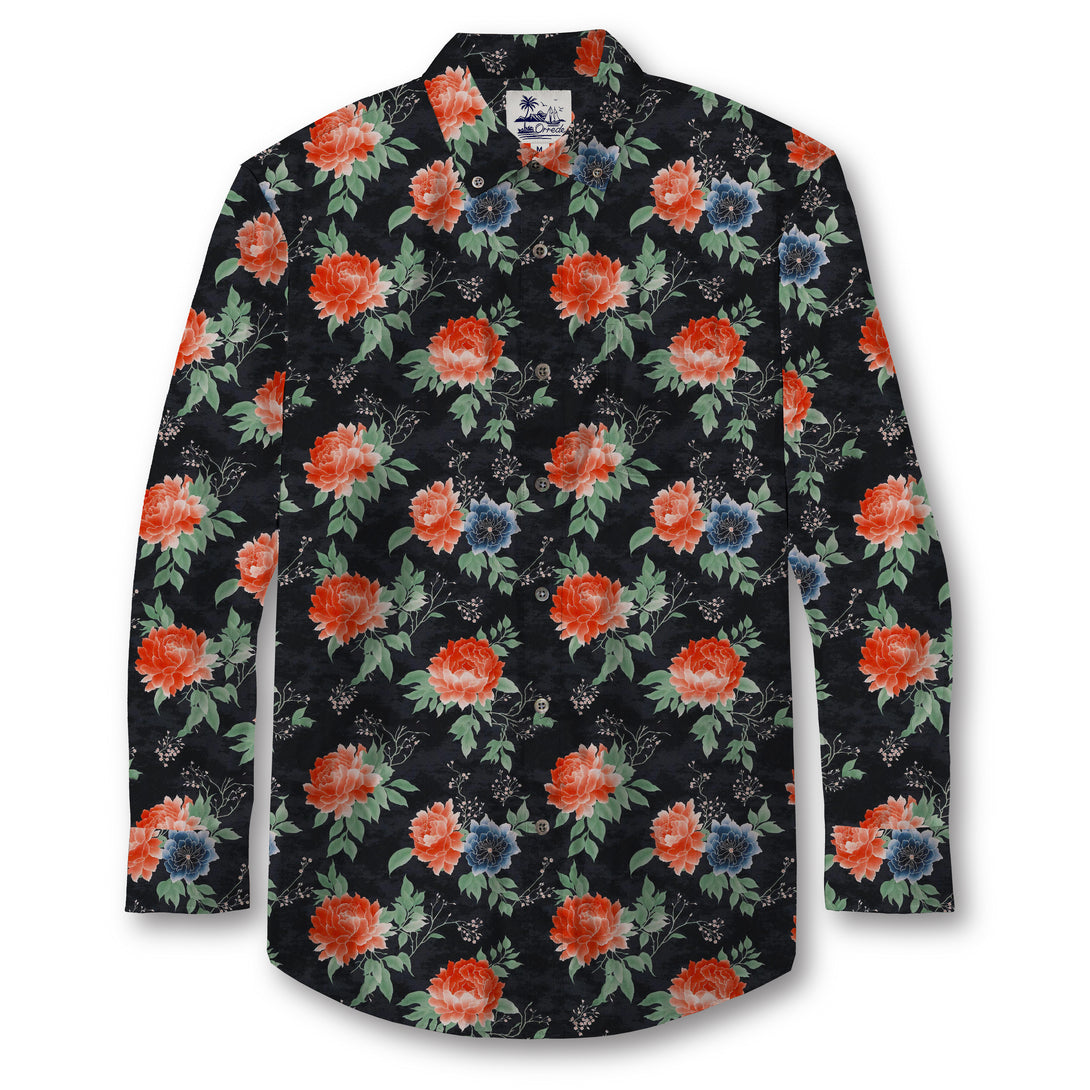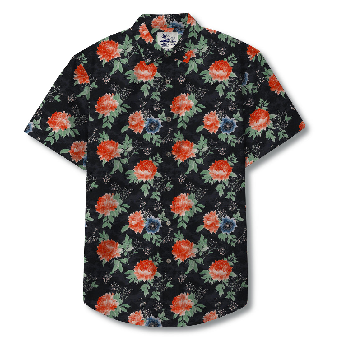 This shirt features a striking floral pattern set against a deep black background. Bold crimson-red peonies bloom vibrantly, their layered petals softened by delicate gradients of coral and pink. Accents of muted green leaves and subtle sprigs of tiny blossoms add depth and freshness, while occasional touches of dark indigo flowers create a dramatic contrast. The design captures a perfect balance between elegance and boldness, evoking the timeless beauty of a midnight garden in full bloom.