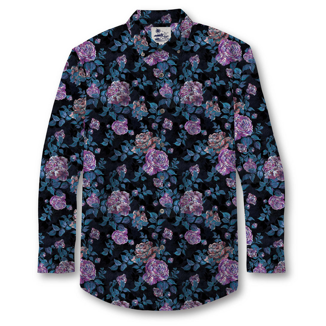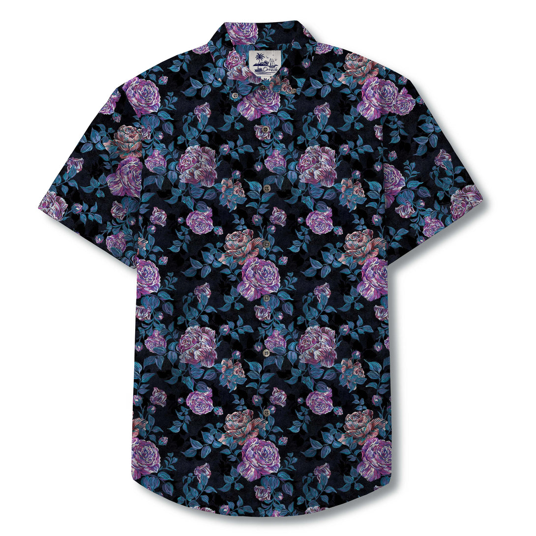 This shirt features a lush, romantic floral pattern with blooming peonies in shades of deep purple, soft lavender, and hints of rose pink. The flowers are complemented by cool-toned teal and navy leaves, all set against a rich, dark background that makes the colors pop. The design feels elegant yet slightly moody, perfect for evening gatherings or a sophisticated casual look.