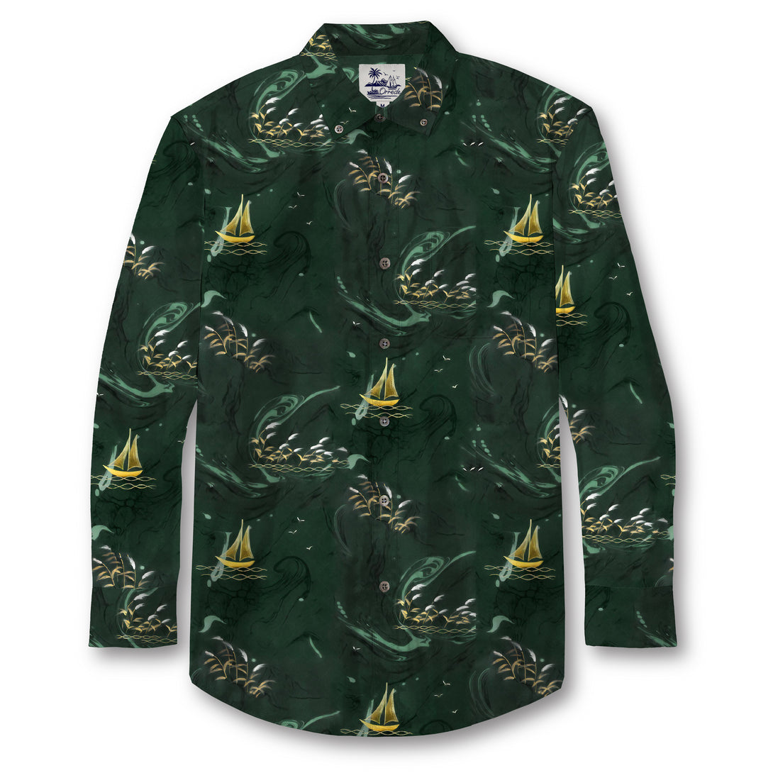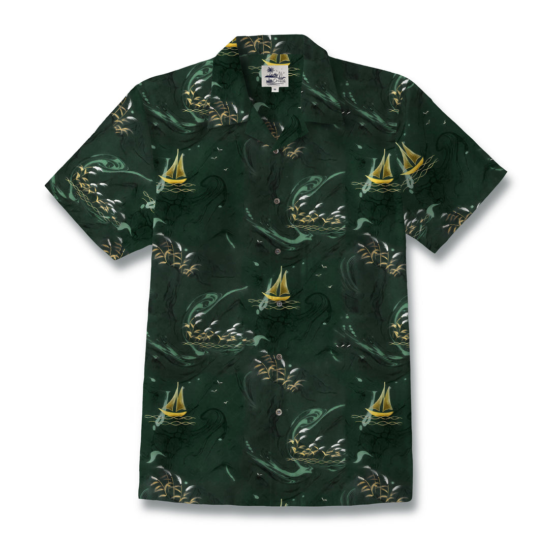 This shirt features a deep forest-green background with a dynamic, swirling ocean motif. Golden sailboats drift gracefully through the waves, creating a sense of calm adventure amidst the dark, mysterious sea. Soft accents of light green and white evoke splashing water and distant seagulls, adding movement and depth to the design. The pattern feels both serene and dramatic, capturing the romance of a solitary voyage at sea.