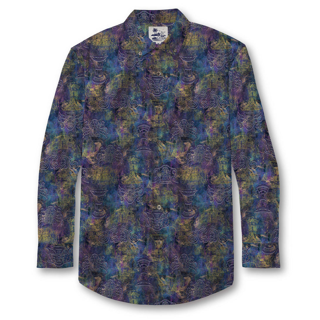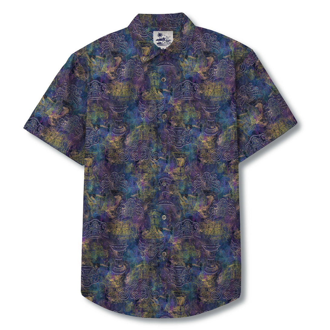 This shirt features a richly layered design that blends deep shades of indigo, emerald, and golden ochre with a swirling, almost cosmic texture. Overlaid across the vibrant backdrop are intricate line drawings of ancient vessels, ornate chalices, and mystical emblems, reminiscent of archaeological artifacts or relics from forgotten civilizations. The overall effect evokes a sense of mystery and timeless grandeur, as if the fabric itself preserves fragments of a lost myth.