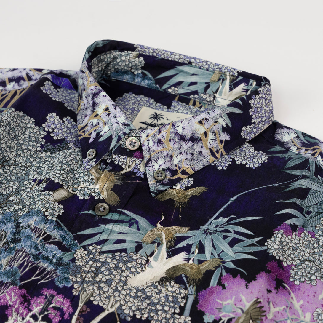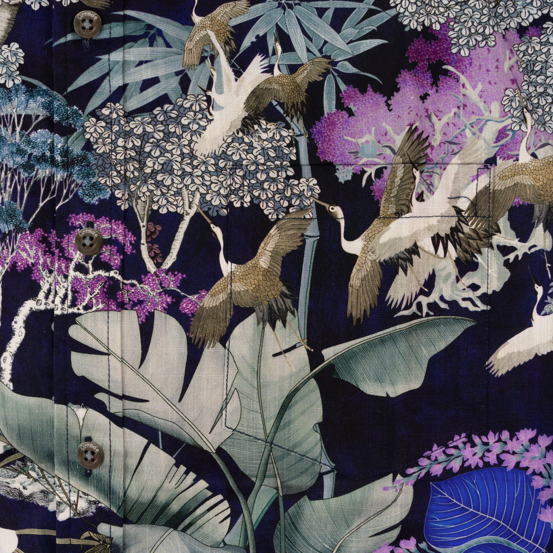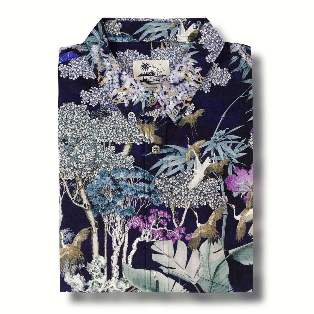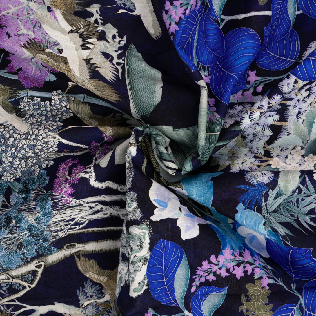 Mystical Canopy transports you into an enchanting forest teeming with life and wonder. The design features elegant cranes soaring through a midnight-hued sky, surrounded by lush botanical elements in shades of deep blue, violet, and teal. Delicate orchids, broad-leaved tropical plants, and ancient trees form a rich tapestry of nature, evoking a sense of serenity and mystery.