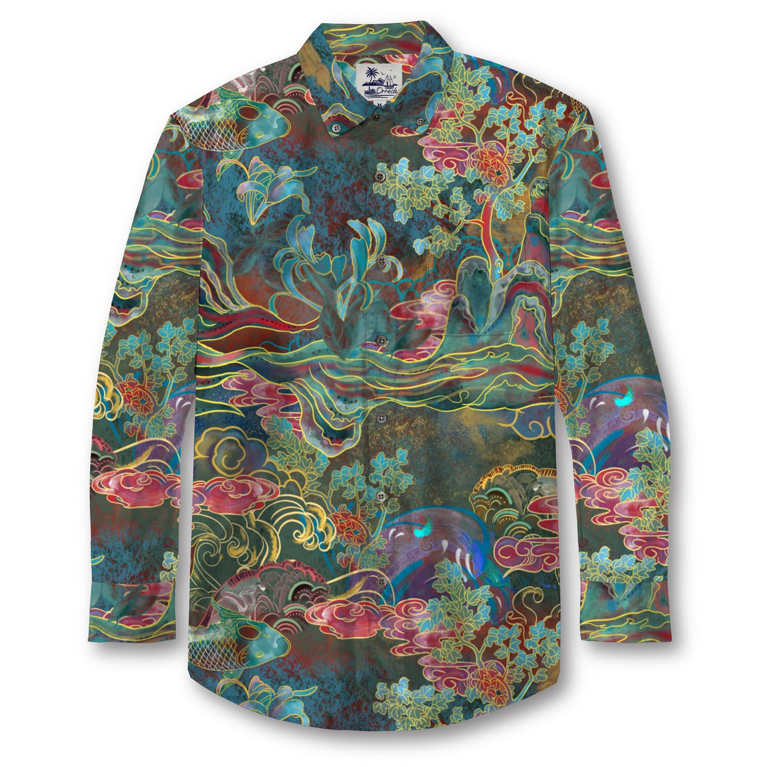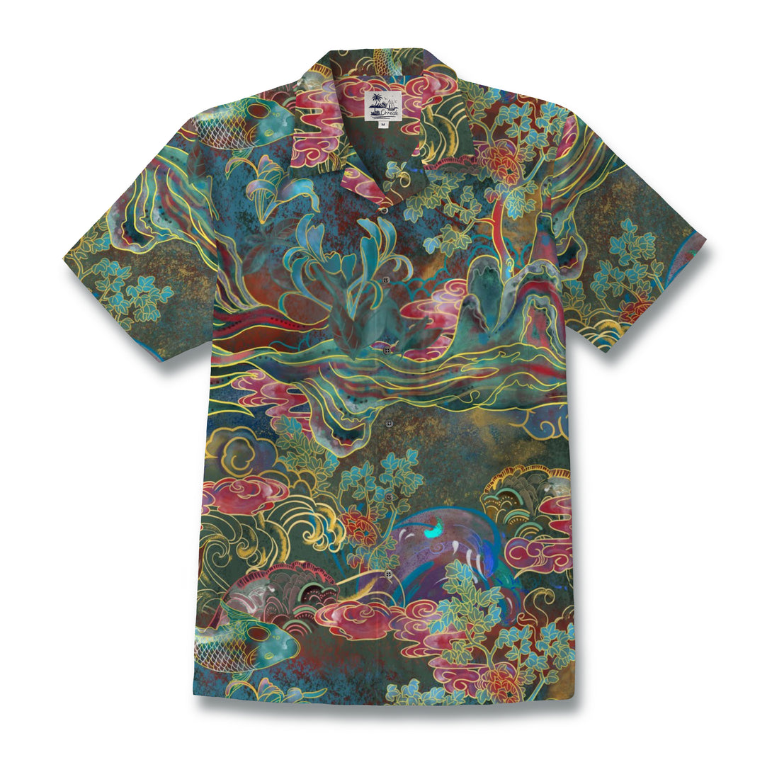 This shirt blends the enchanting aesthetics of Eastern fantasy with modern casual design. Set against a deep green base, the pattern features koi fish, swirling clouds, lush plants, and misty landscapes, rendered with dynamic lines and vibrant colors—reds, blues, and golds—that evoke the feel of a mythical Eastern scroll. Combining traditional symbols of good fortune, like the koi, with a contemporary shirt silhouette, it offers both artistic richness and a bold, fashion-forward statement.
