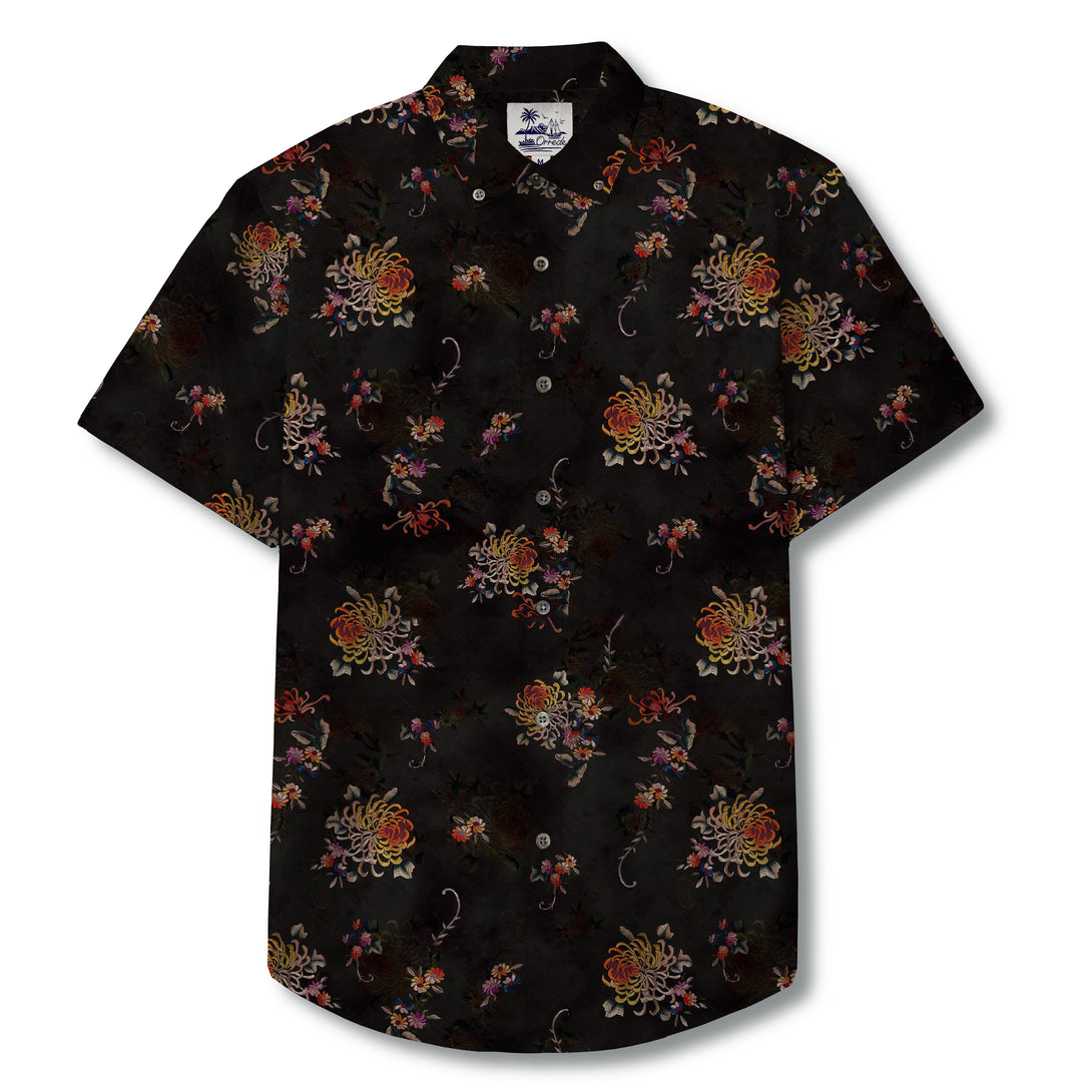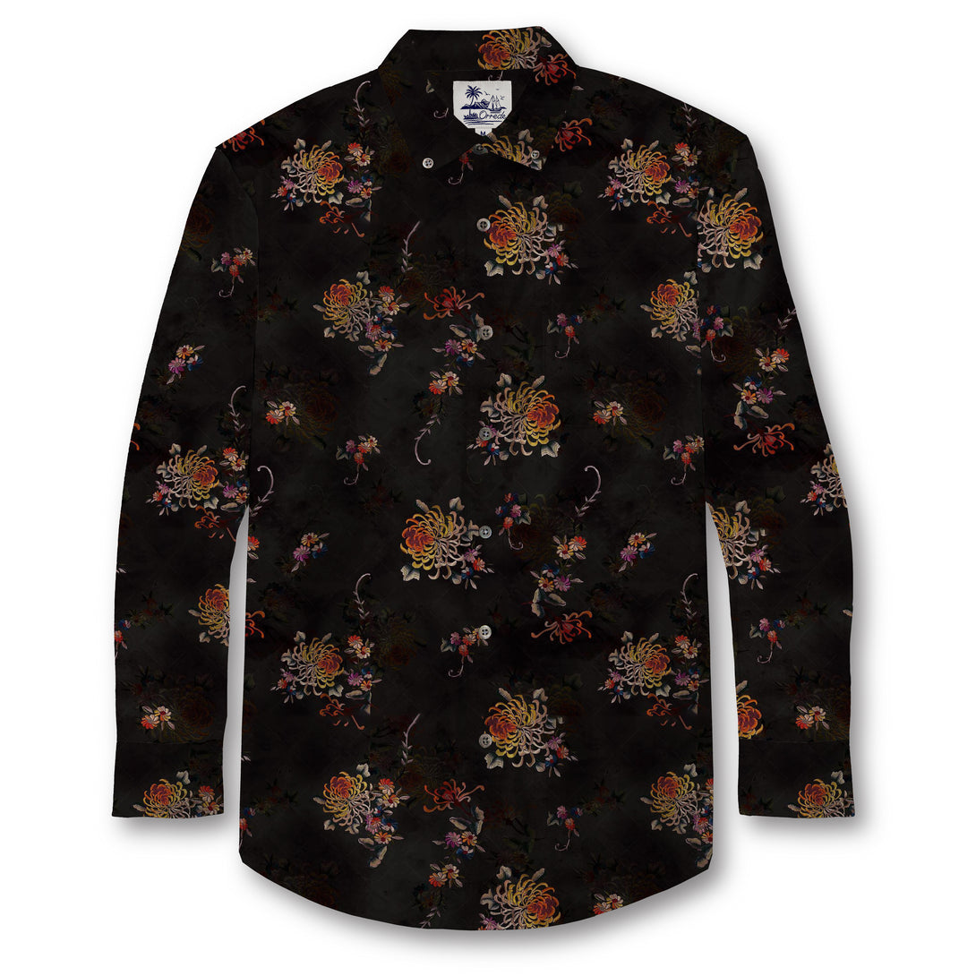 This design features an elegant tapestry of stylized chrysanthemums and delicate wildflowers, blooming vividly against a dark, textured background reminiscent of lacquered tiles. The florals, rendered in rich hues of gold, crimson, ivory, and lavender, seem to glow like embroidery under moonlight. Intricate vine-like stems and subtle leaves enhance the vintage East Asian aesthetic, creating a sense of refined drama and quiet opulence. The interplay between vibrant blossoms and the shadowy backdrop evokes a mysterious, almost poetic atmosphere—perfect for fashion pieces that blend tradition with allure.