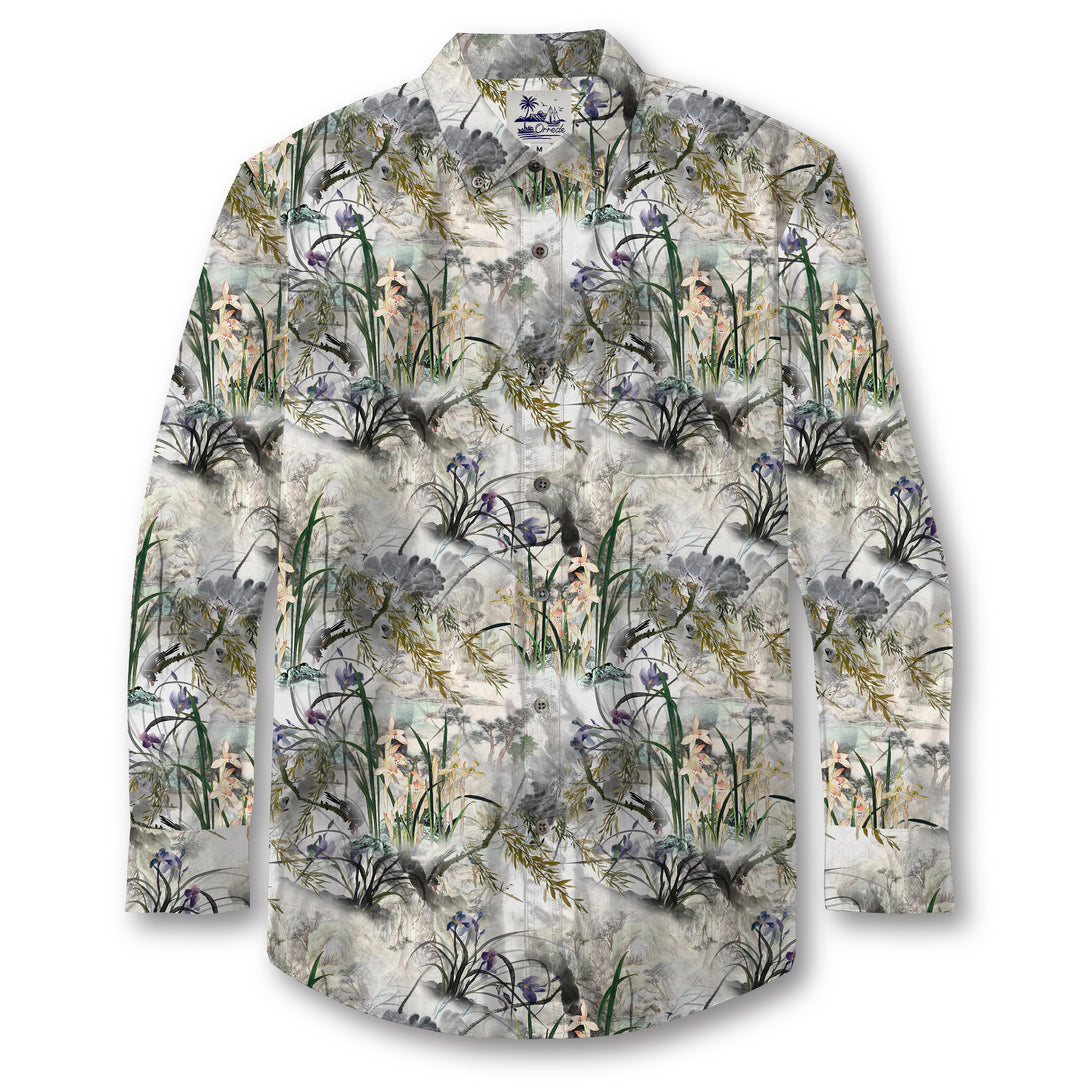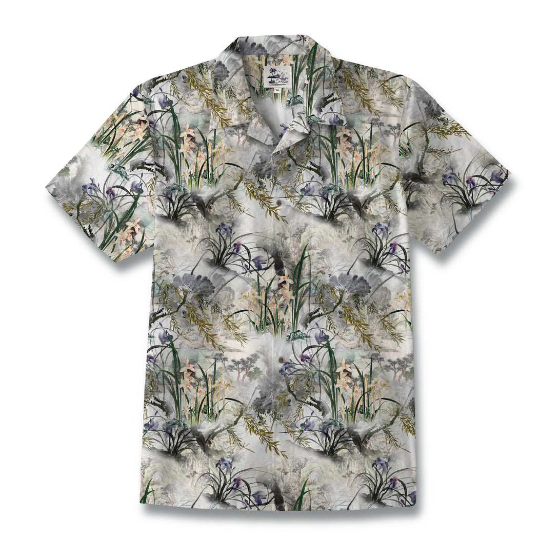This ethereal pattern captures the poetic essence of traditional East Asian brush painting, merging soft ink wash landscapes with vivid botanical illustrations. Graceful irises and narcissus bloom amidst misty pine-covered hills, while delicate bamboo leaves drift through a dreamlike haze. Subtle shades of lavender, forest green, and muted earth tones create a serene, almost meditative ambiance—an homage to nature’s quiet beauty and seasonal renewal.