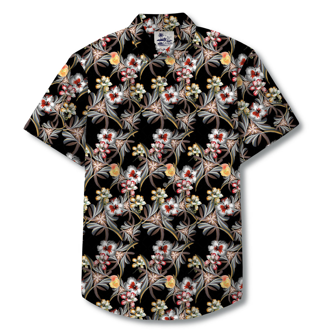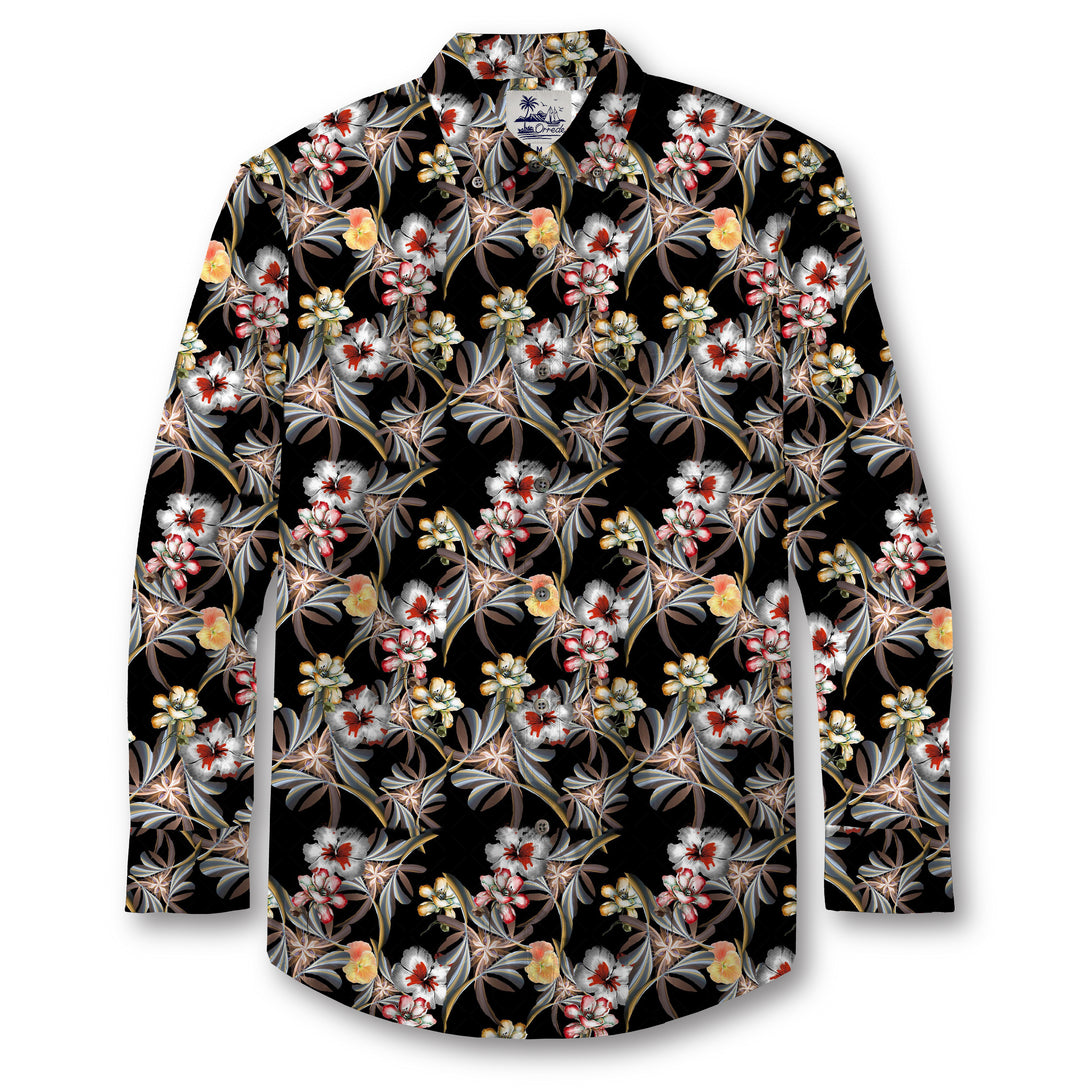 This shirt showcases a lush botanical design featuring clusters of delicate orchids and tropical blossoms in soft shades of white, yellow, and red. The flowers are interwoven with long, graceful leaves in earthy browns and muted greens, creating an elegant flow across a deep black background. The contrast between the vibrant blooms and the dark base enhances the richness of the design, giving it a refined yet exotic appeal.