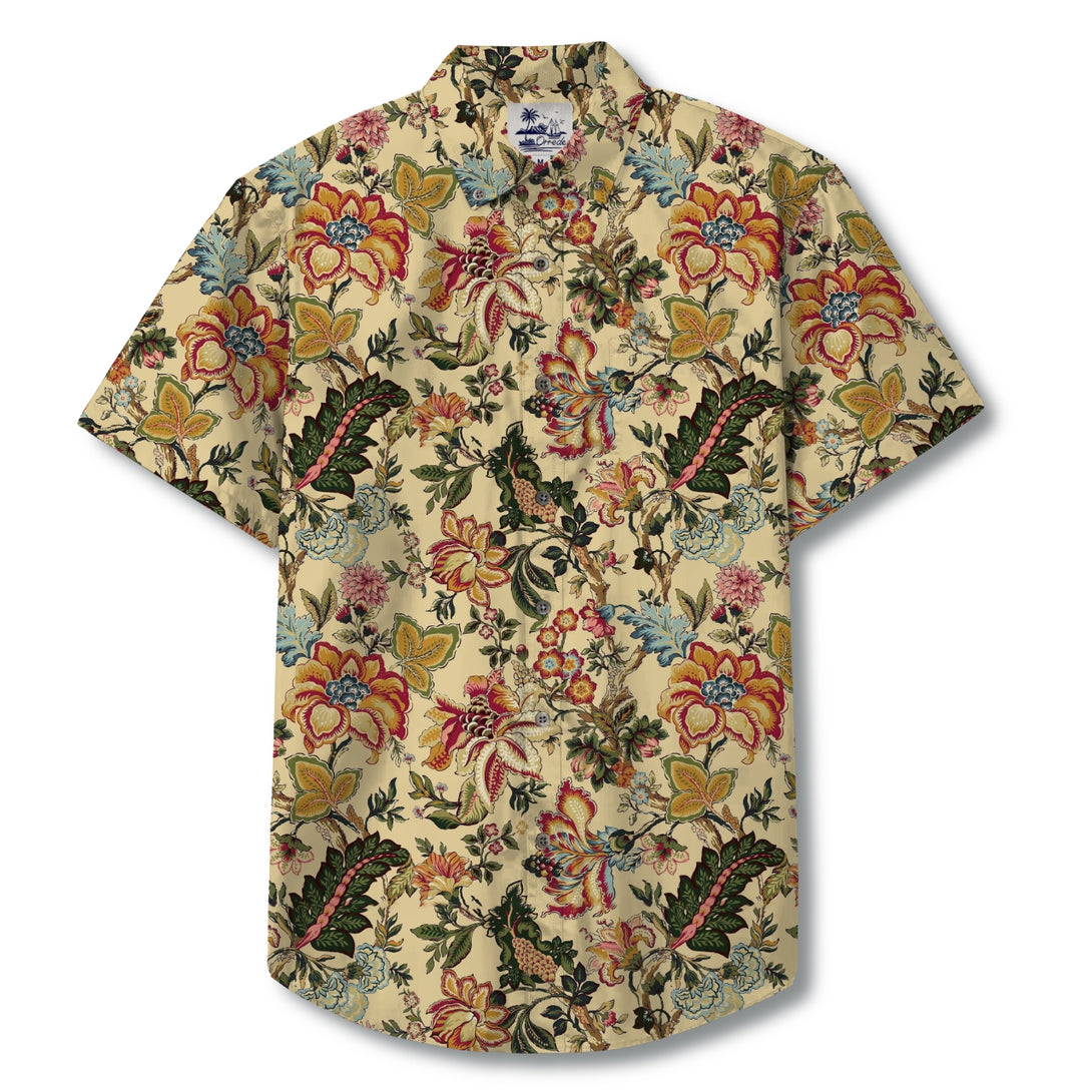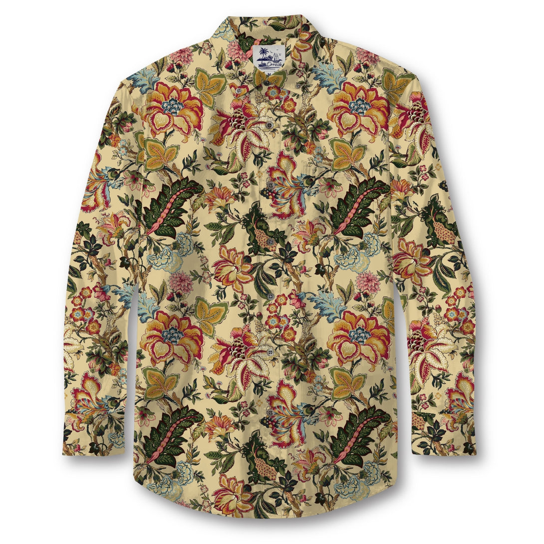 This shirt features a richly detailed botanical design that evokes the charm of an antique tapestry. Large, intricately illustrated flowers in warm reds, soft blues, mustard yellows, and pale greens bloom against a muted beige background. Stylized foliage and swirling stems weave throughout the pattern, giving it a lush, layered texture. The overall aesthetic is both vintage and vibrant, reminiscent of classic European floral motifs with a tropical flair. Perfect for those who appreciate bold elegance and timeless artistry in their wardrobe.