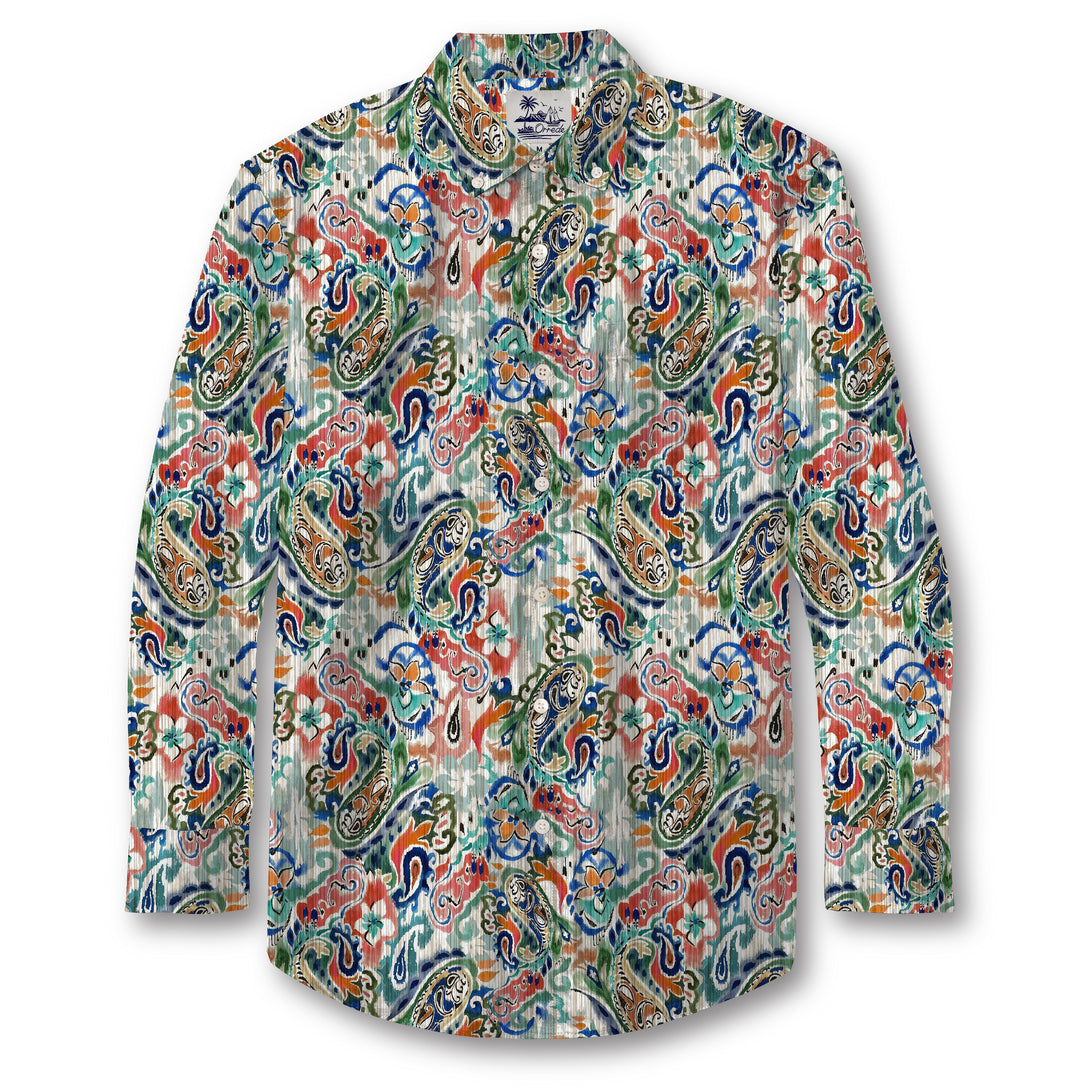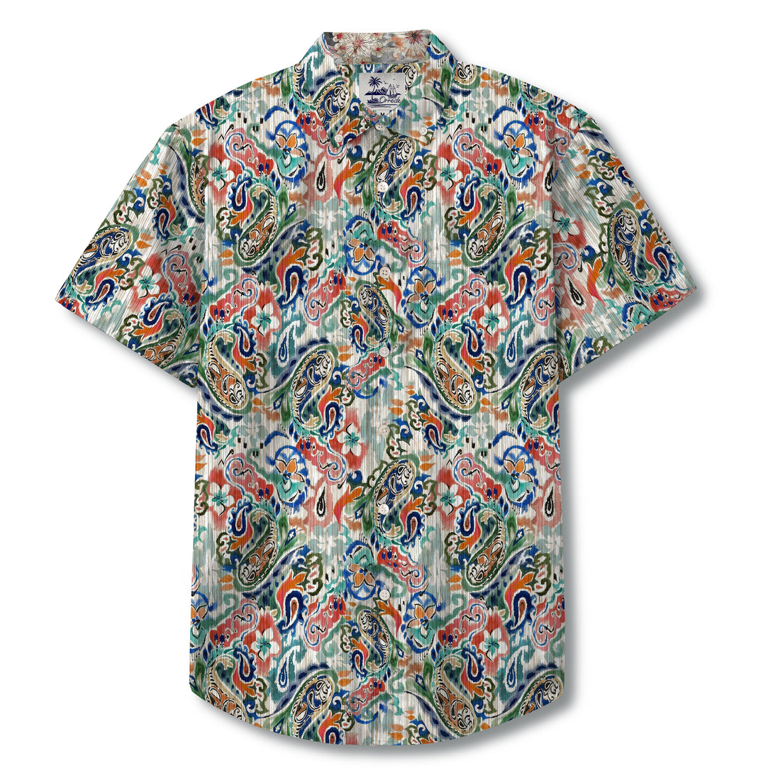 This shirt features a lively all-over design blending paisley motifs with floral accents. The swirling teardrop shapes are filled with intricate details in deep navy, green, and golden tones, while soft coral and sky-blue flowers add a playful contrast. Set against a subtle striped background, the pattern creates a vibrant yet harmonious fusion of traditional paisley with tropical-inspired flourishes.