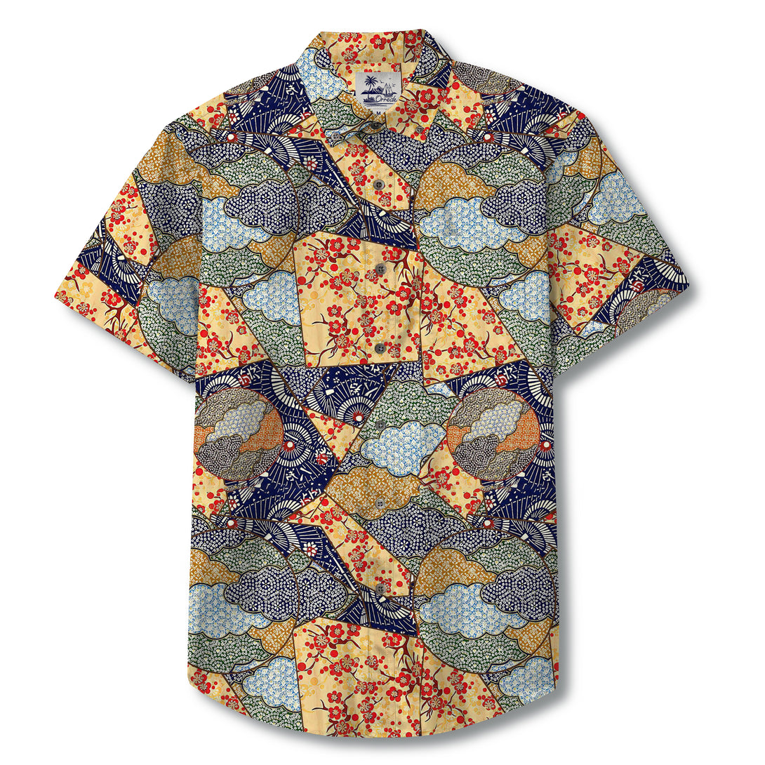 This design features a vibrant patchwork composition inspired by traditional Japanese aesthetics. The pattern interweaves panels of stylized clouds, delicate plum blossoms, geometric waves, and intricate foliage, all set against a warm yellow backdrop. Deep navy, soft blue, earthy green, and hints of red and orange create a harmonious blend of color, giving the shirt a rich, layered texture. The interplay of natural motifs and geometric precision evokes both the elegance of classic kimono fabrics and the dynamic energy of modern artistry.