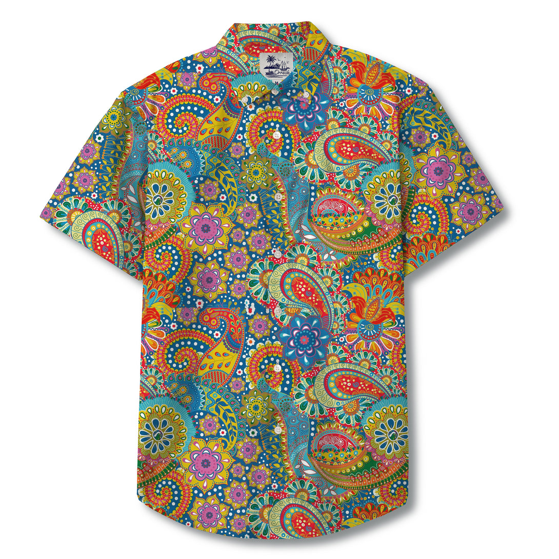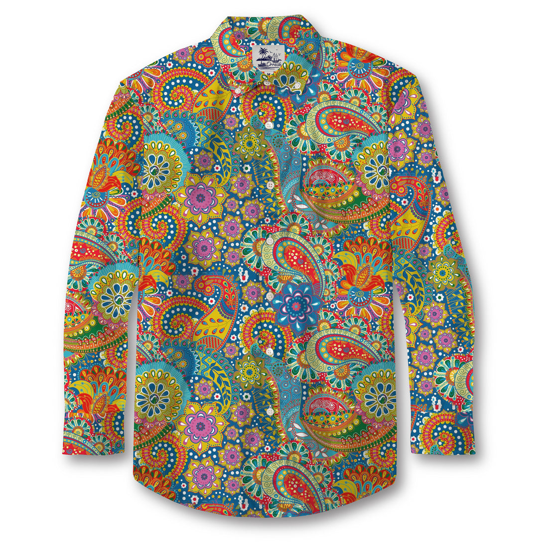 A kaleidoscopic explosion of joy, this vibrant design fuses swirling paisley motifs with ornamental peacocks and blooming florals. Bold reds, rich teals, sunflower yellows, and electric blues create a symphony of color that feels both festive and exotic. Inspired by Indian folk art and bohemian energy, each detail invites celebration—like a parade printed in fabric form. This shirt isn’t just worn, it’s danced in.