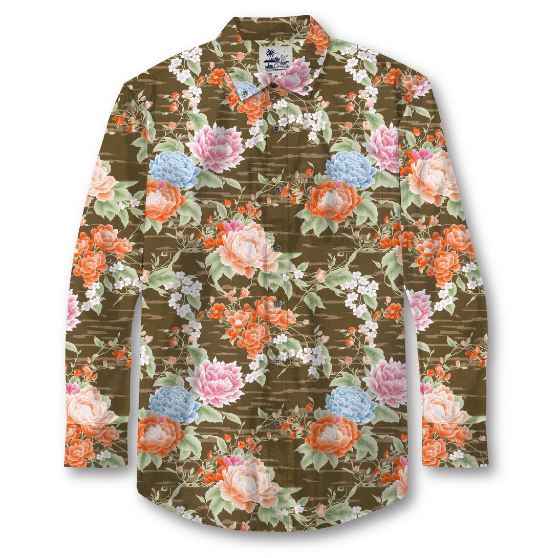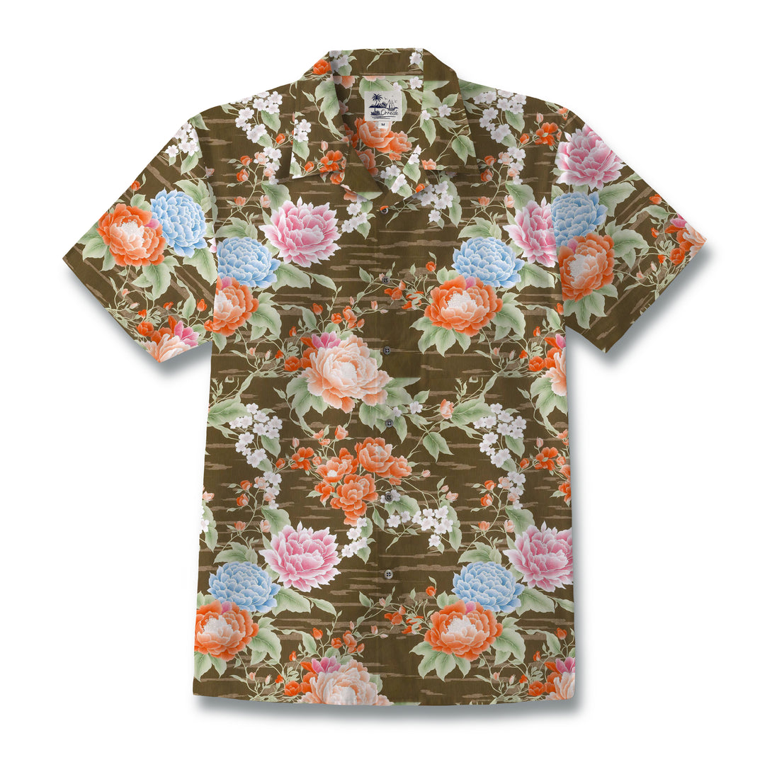 This shirt features an exquisite arrangement of blooming peonies in shades of coral, blush pink, and sky blue, set against an earthy olive-brown background. The soft interplay of delicate white blossoms and leafy green accents creates a harmonious balance between bold vibrancy and natural elegance. With its painterly floral details, this design captures the timeless beauty of traditional garden motifs, reimagined for a modern aloha shirt.