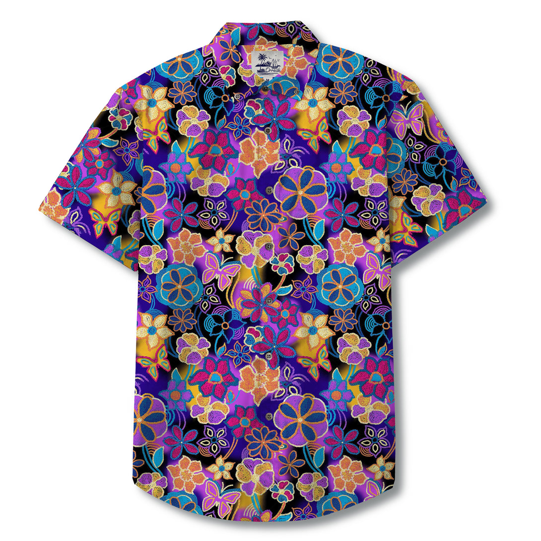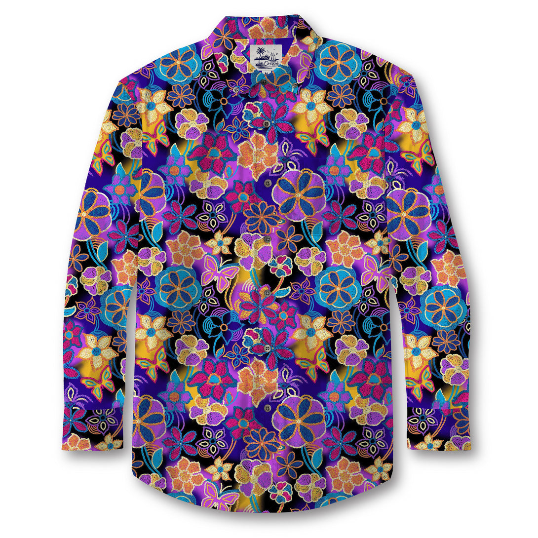 This shirt bursts with a kaleidoscope of tropical blossoms, rendered in vivid jewel tones—deep purples, ocean blues, fiery oranges, and golden yellows. Each flower is outlined with intricate, bead-like textures reminiscent of traditional embroidery or batik art. Layered petals and swirling forms create a rhythmic, almost ceremonial flow across the fabric, evoking both island festivity and timeless artistry. The overlapping blooms give a sense of abundance, as if one were wandering through a lush, moonlit garden alive with color and fragrance.