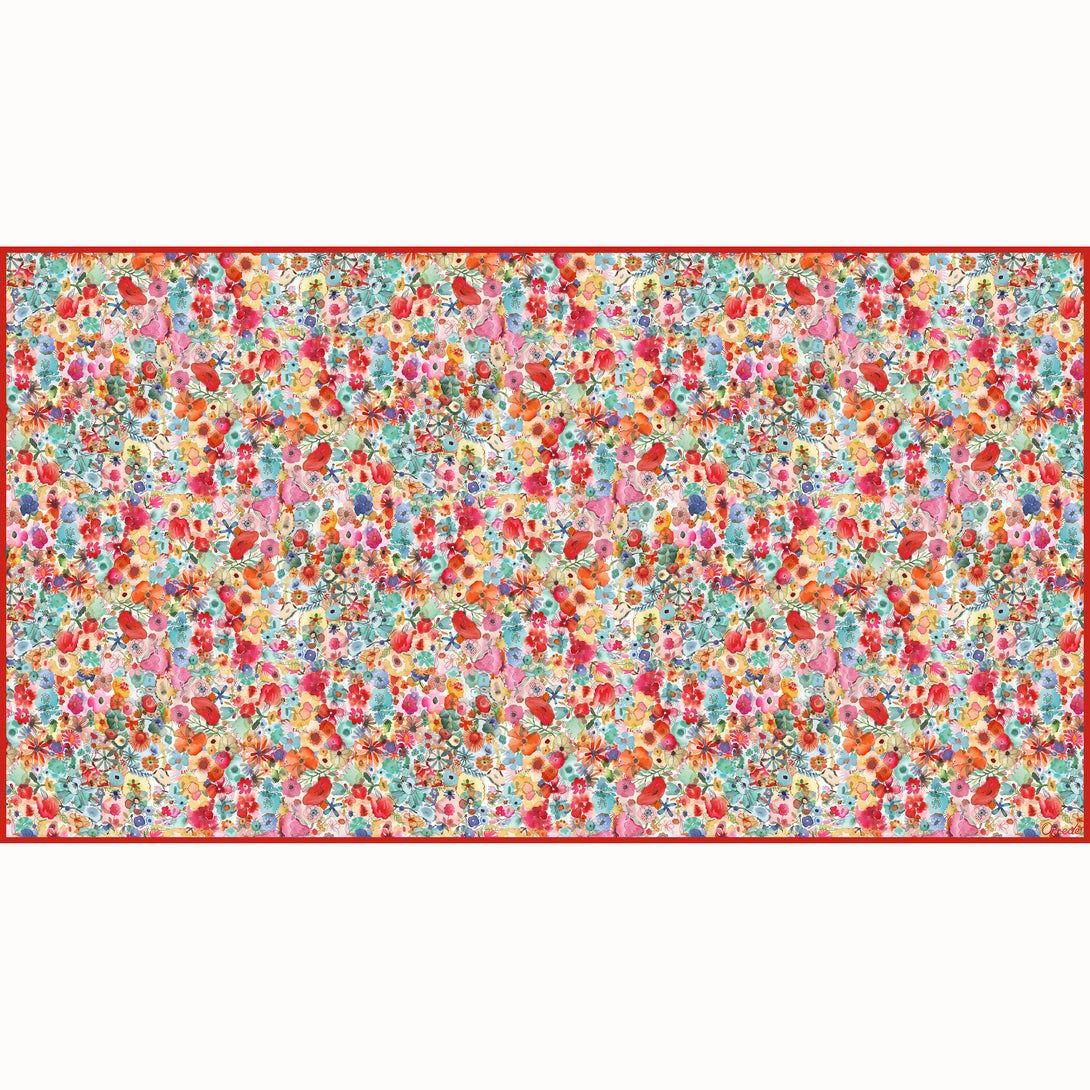 This design features a vibrant and whimsical floral design that bursts with color and energy. The pattern showcases a diverse array of blossoms in red, pink, orange, blue, and yellow, interspersed with green foliage. Delicate details, such as butterflies and small botanical accents, add a touch of charm and playfulness. The watercolor-style artwork creates a light, airy aesthetic, perfect for summer or tropical vibes.
