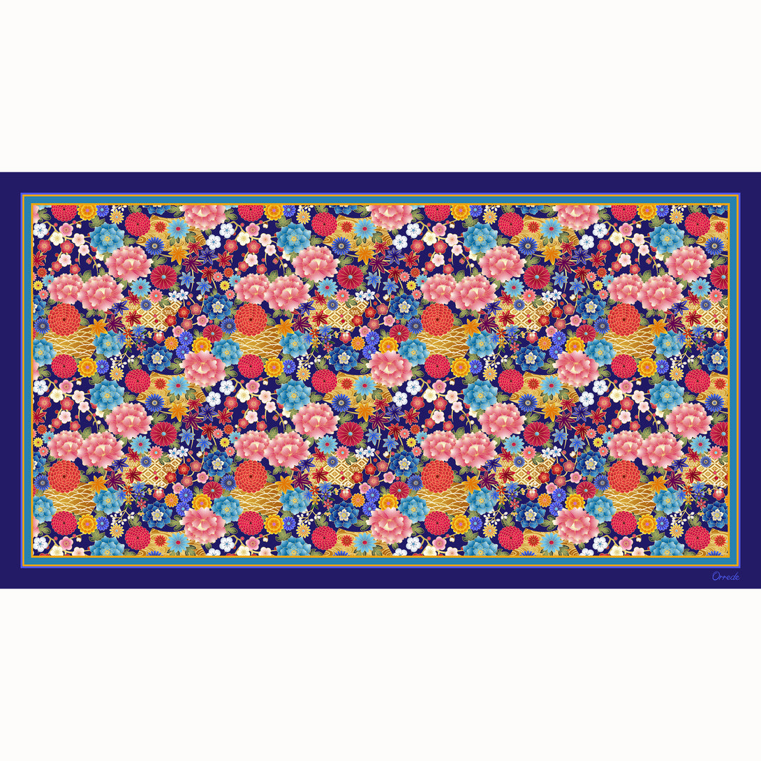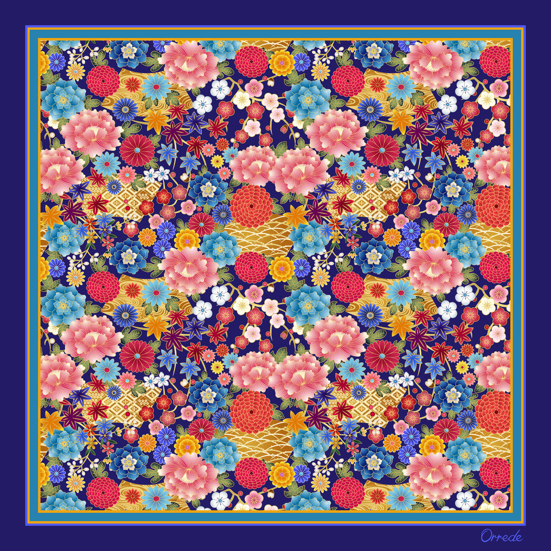Radiant Bloom is a striking design set on a deep blue canvas, where an explosion of colorful flowers blooms in full splendor. The flowers, in a harmonious mix of vibrant shades, from soft pinks to fiery oranges, create a lively contrast against the rich blue backdrop. Golden yellow accents weave through the petals, adding a radiant touch of warmth and sophistication. This floral design captures the beauty and energy of nature's most vibrant blooms, perfect for those who seek elegance and boldness in their style.