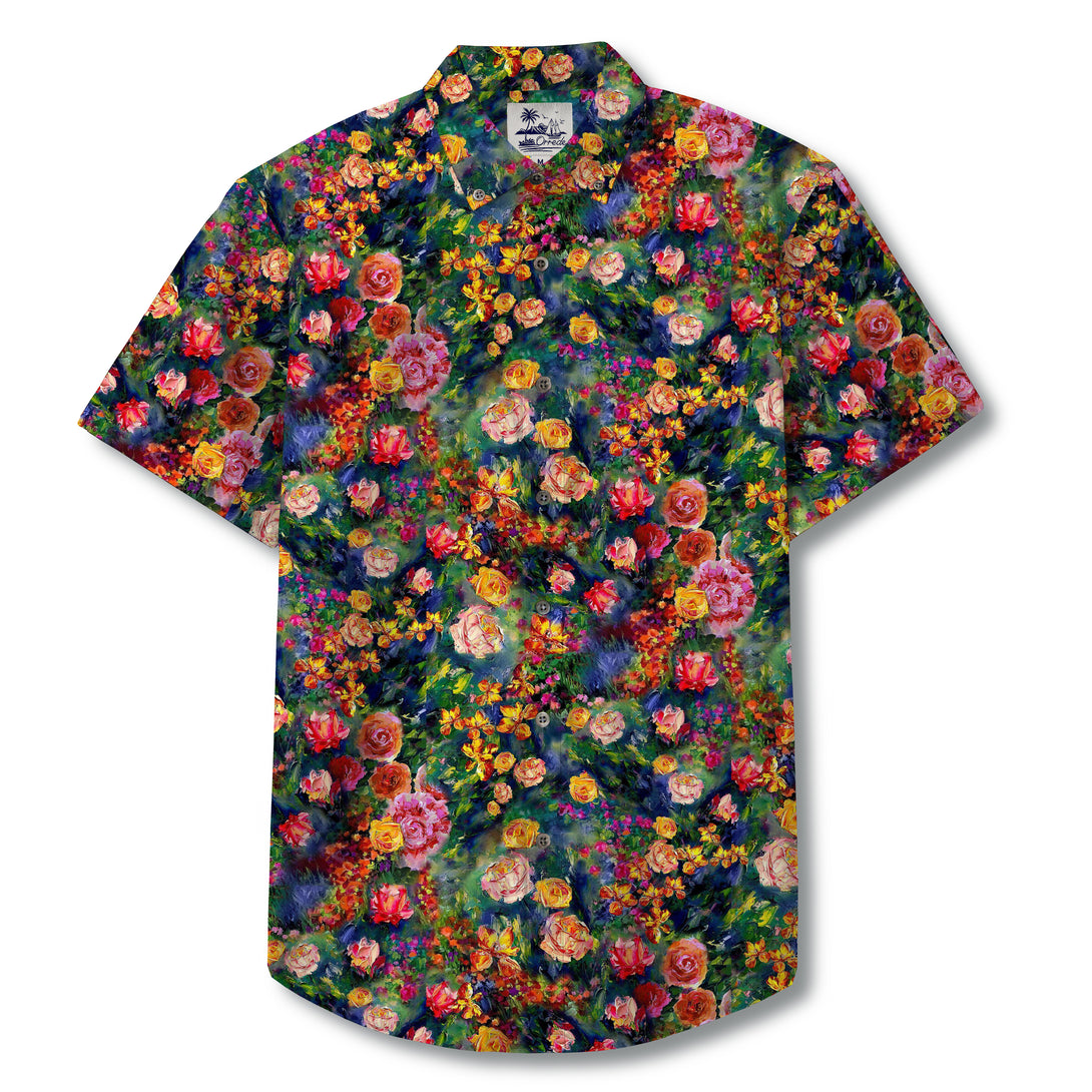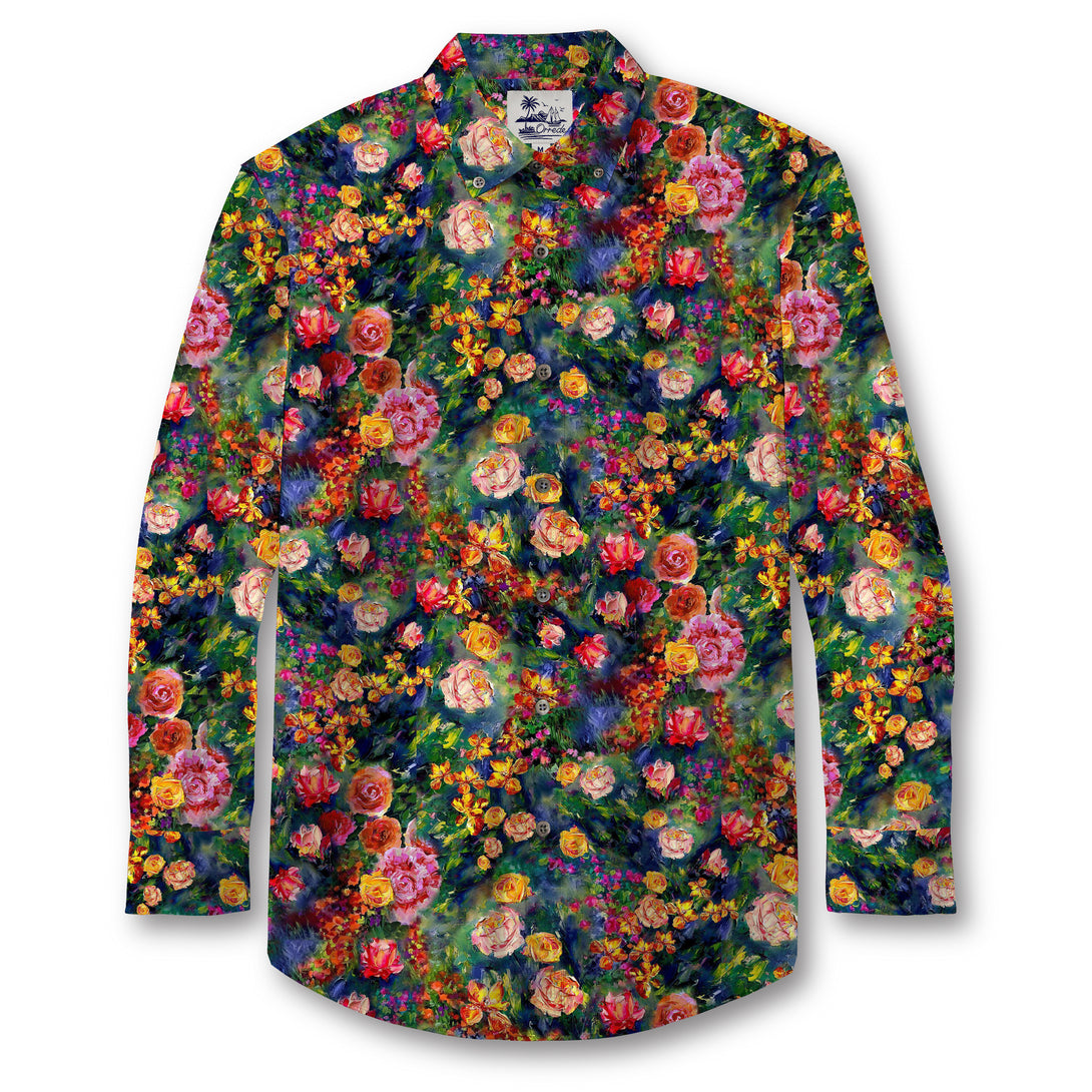 This vibrant pattern bursts with the energy of a blooming garden at its peak. Lush roses in shades of pink, peach, coral, and fiery orange dance alongside golden orchids and clusters of tiny magenta blossoms. The brushstroke texture gives the design an oil-painted impressionist feel, blending deep emerald greens and sapphire blues with vivid floral highlights. The dynamic composition creates a sense of movement, as if the flowers are swaying gently in a summer breeze.