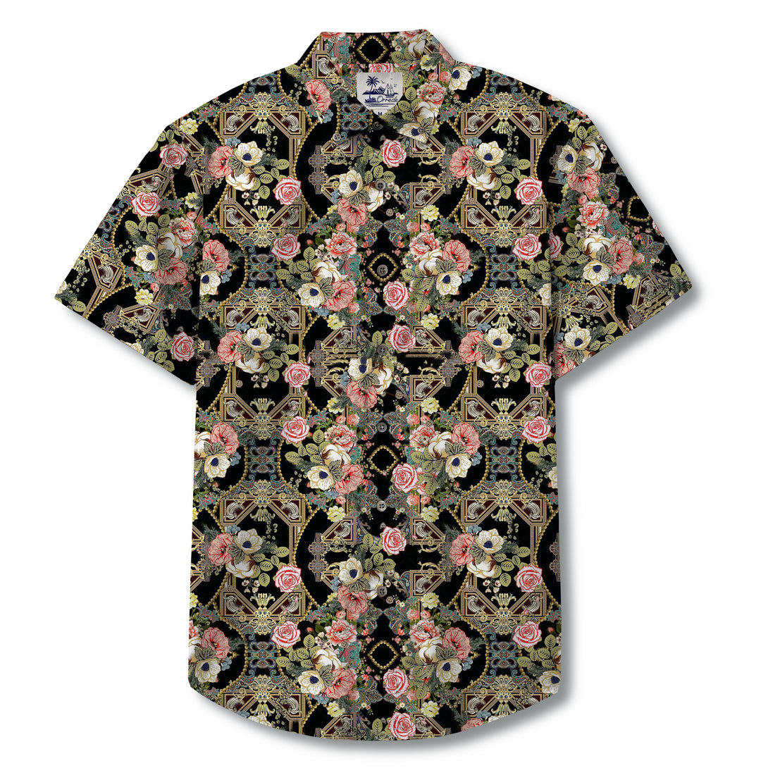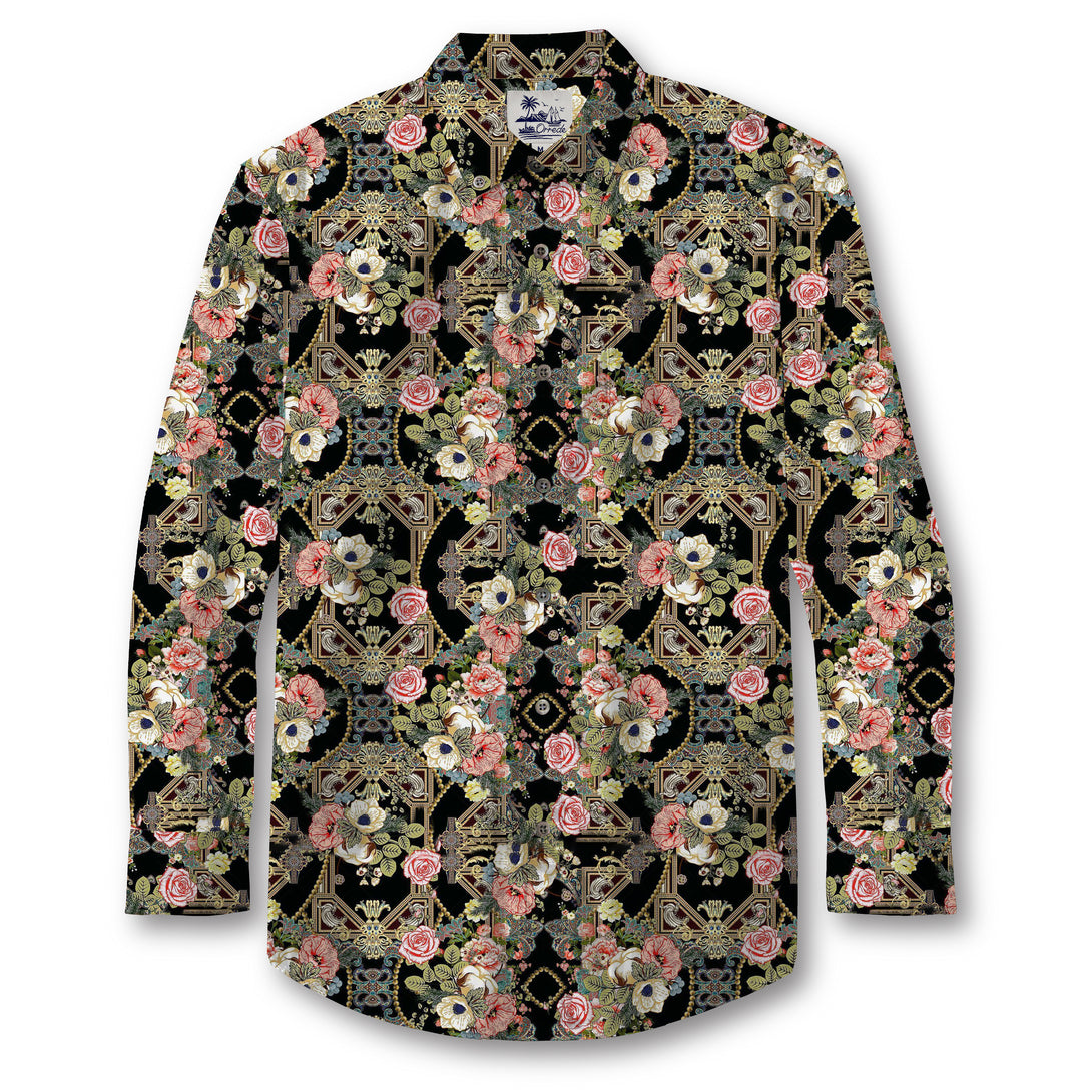 This ornate pattern features a rich fusion of vintage baroque motifs and lush botanical elements. Delicate roses, anemones, and blooming poppies intertwine with intricate golden scrollwork and symmetrical lattice structures, all set against a deep black background. The contrast between the vibrant floral clusters and the regal, geometric framework evokes an air of timeless elegance and romantic opulence. The overall design has a tapestry-like effect, reminiscent of antique European textiles and royal garden murals.