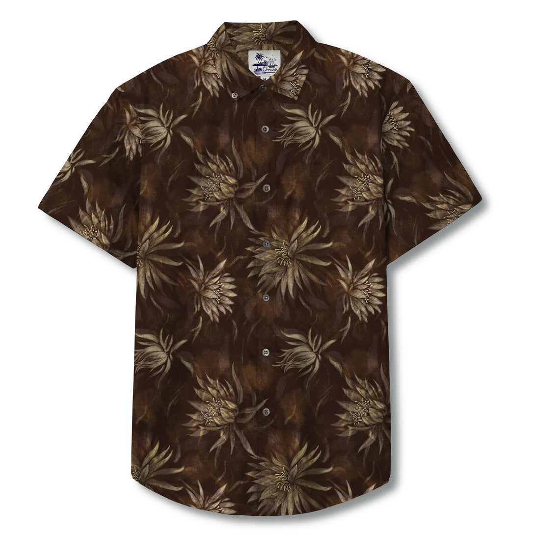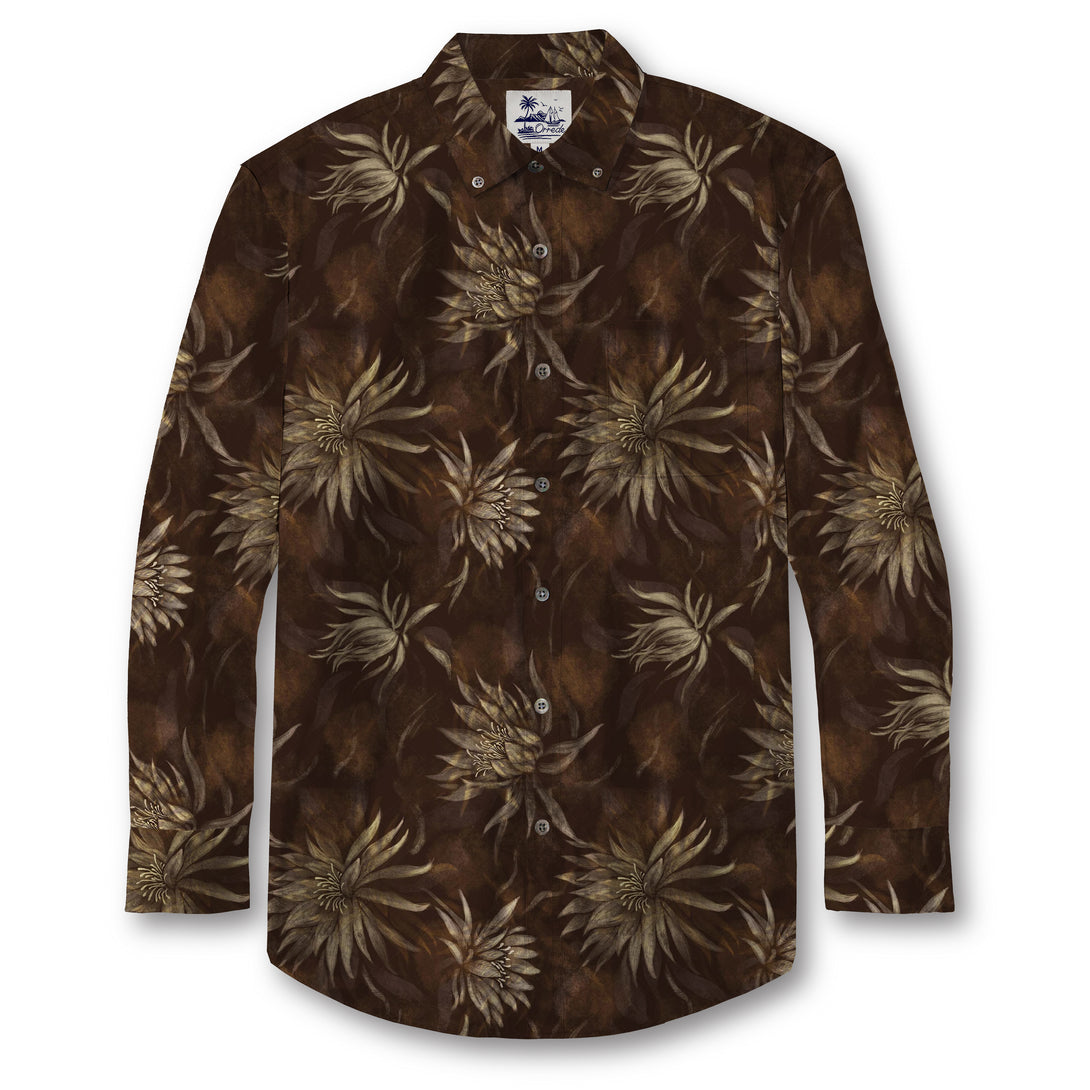 The shirt features a rich, earthy brown background with painterly textures that resemble swirling dusk clouds. Overlaid are large, elegant tropical flowers rendered in muted tones of taupe, beige, and soft gold. The floral motifs evoke the mysterious beauty of night-blooming flowers, blending seamlessly with the shadowy backdrop to create a look that’s both dramatic and refined.
