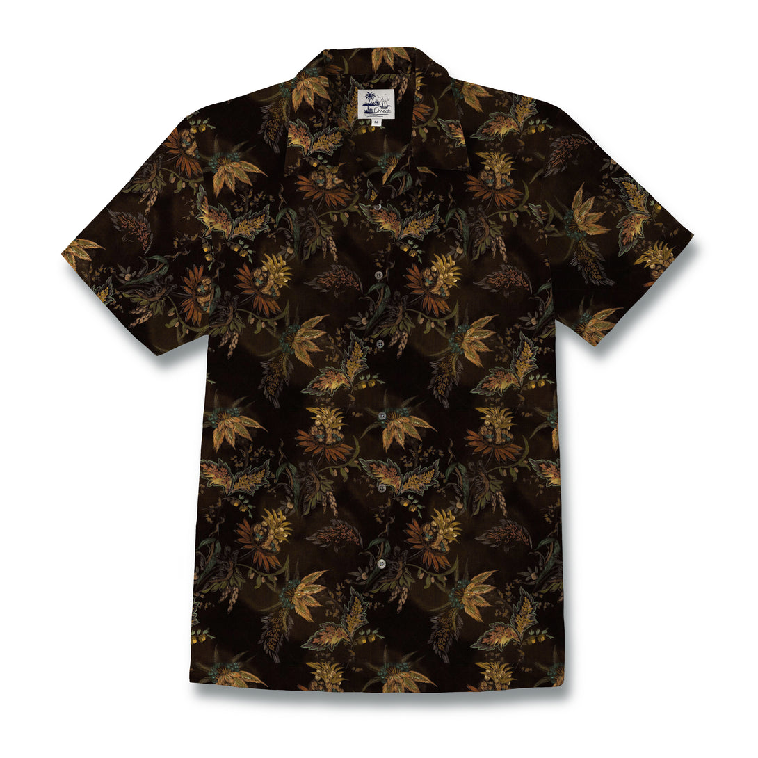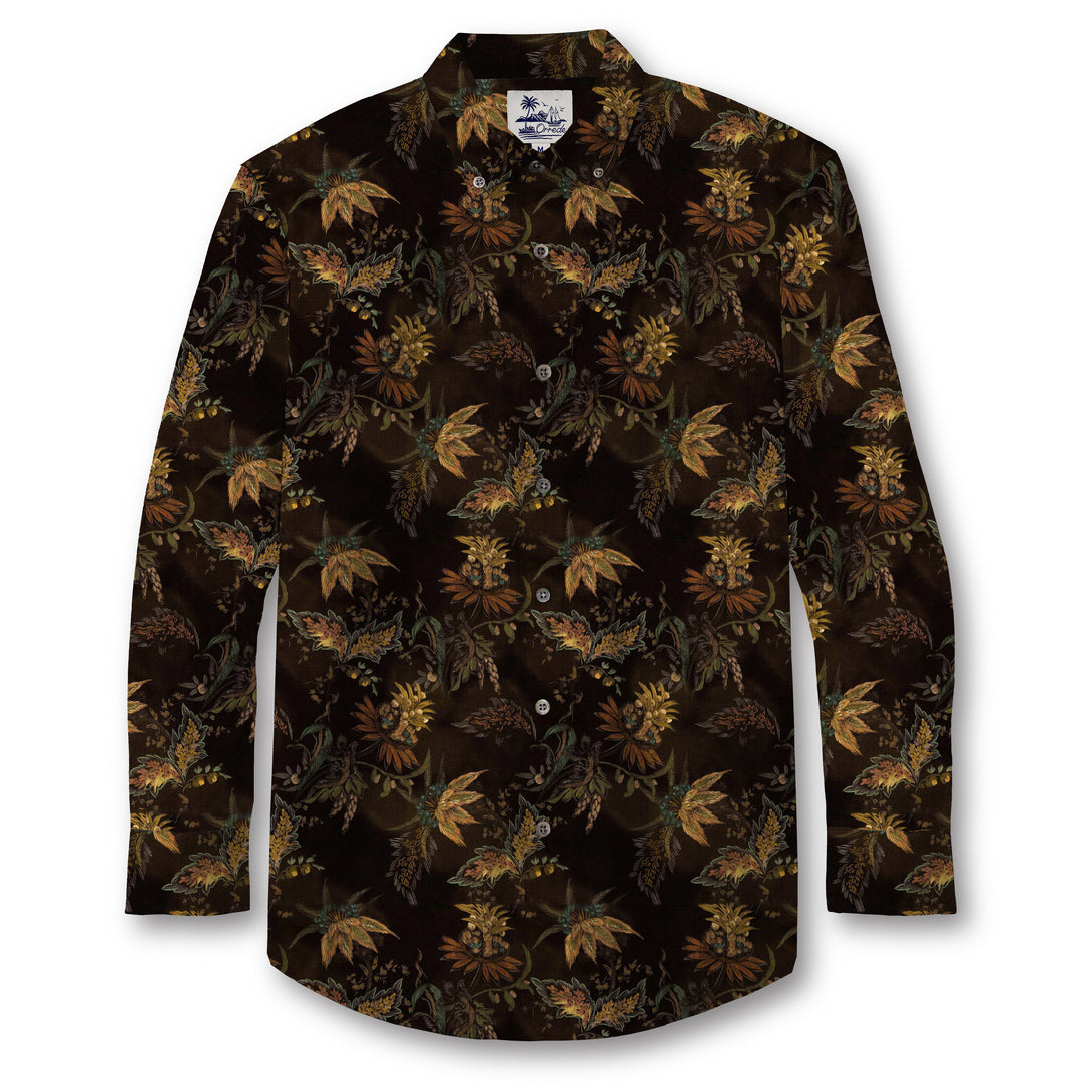 This shirt features a deep, dark-toned background adorned with an intricate floral and foliage pattern. The design showcases a blend of exotic leaves and blooming flowers in shades of gold, bronze, olive, and muted green. The overall aesthetic feels lush and mysterious, like a dense tropical garden at dusk. The painterly texture of the elements adds an artistic and vintage charm, while the color palette keeps it grounded and versatile. Perfect for evening occasions or a standout casual look, this shirt brings a quiet, refined boldness.