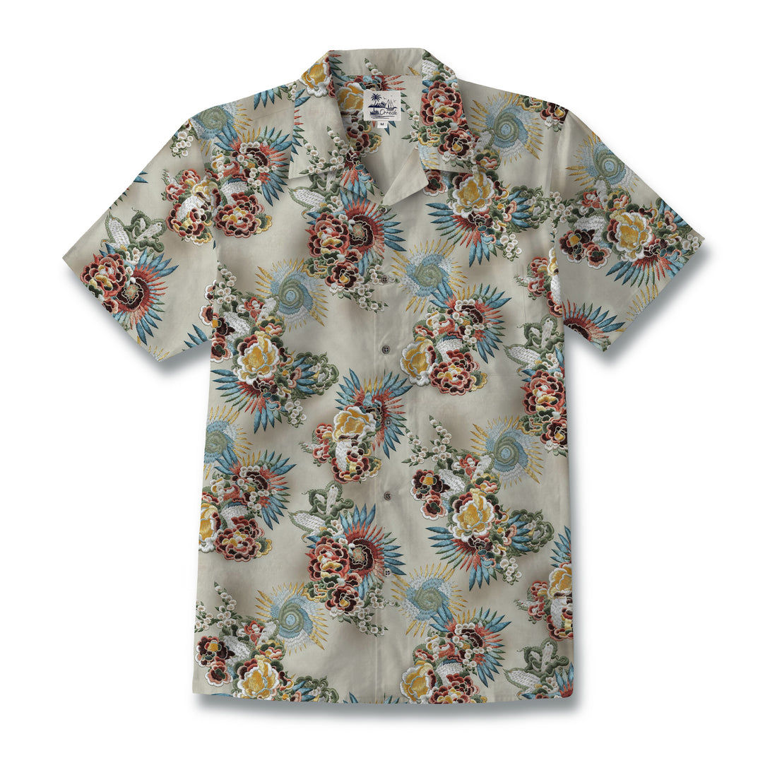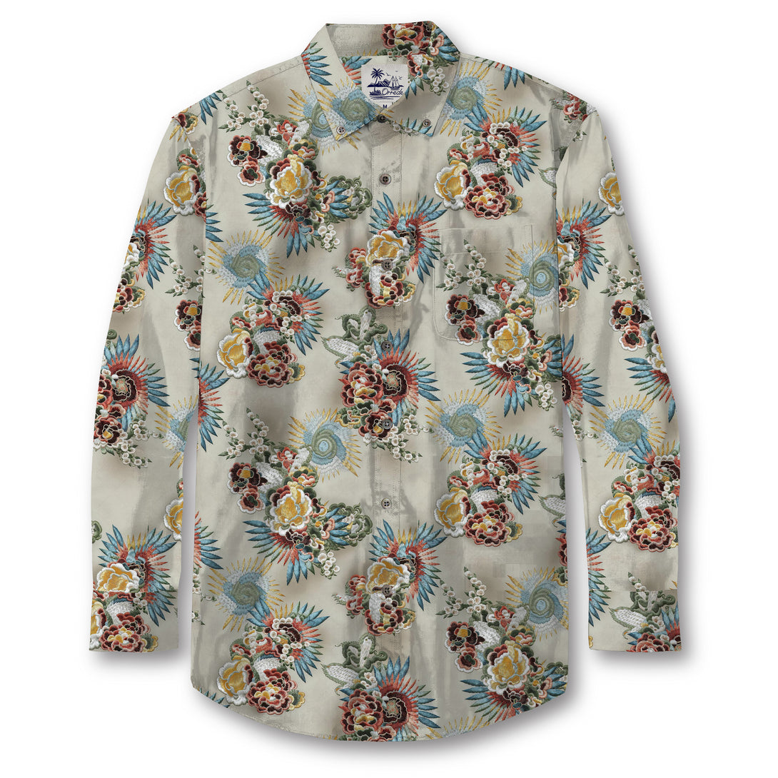 This design evokes the feeling of a sun-drenched dreamscape where nature meets celestial wonder. Vivid floral clusters in crimson, ochre, and ivory seem to burst like miniature supernovas, each encircled by radiant, sun-like halos in shades of blue and gold. The neutral beige background softens the visual energy, allowing the dynamic floral and spiral motifs to shimmer with contrast and movement. There’s a surreal, almost mythological feel—like desert blooms thriving under cosmic suns.