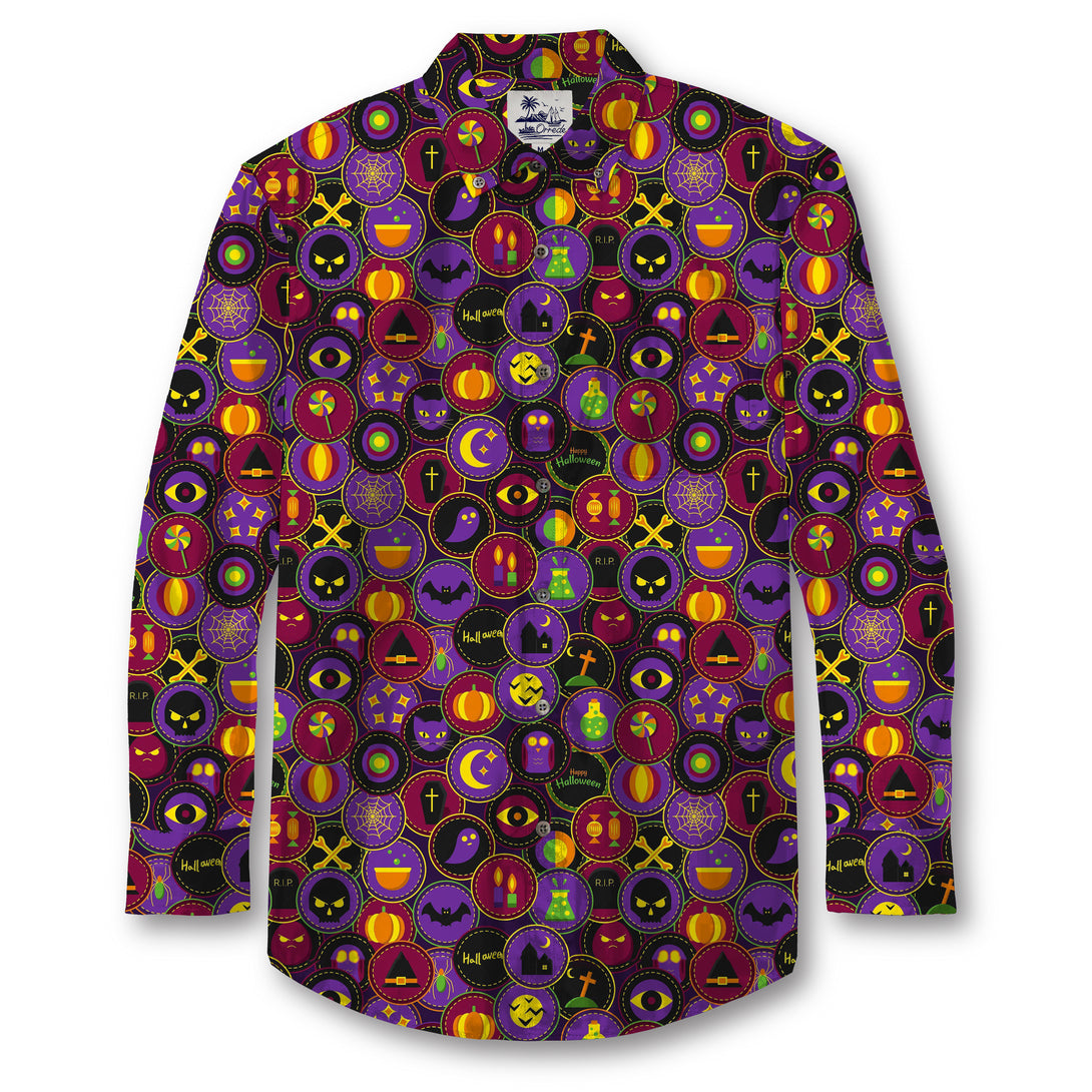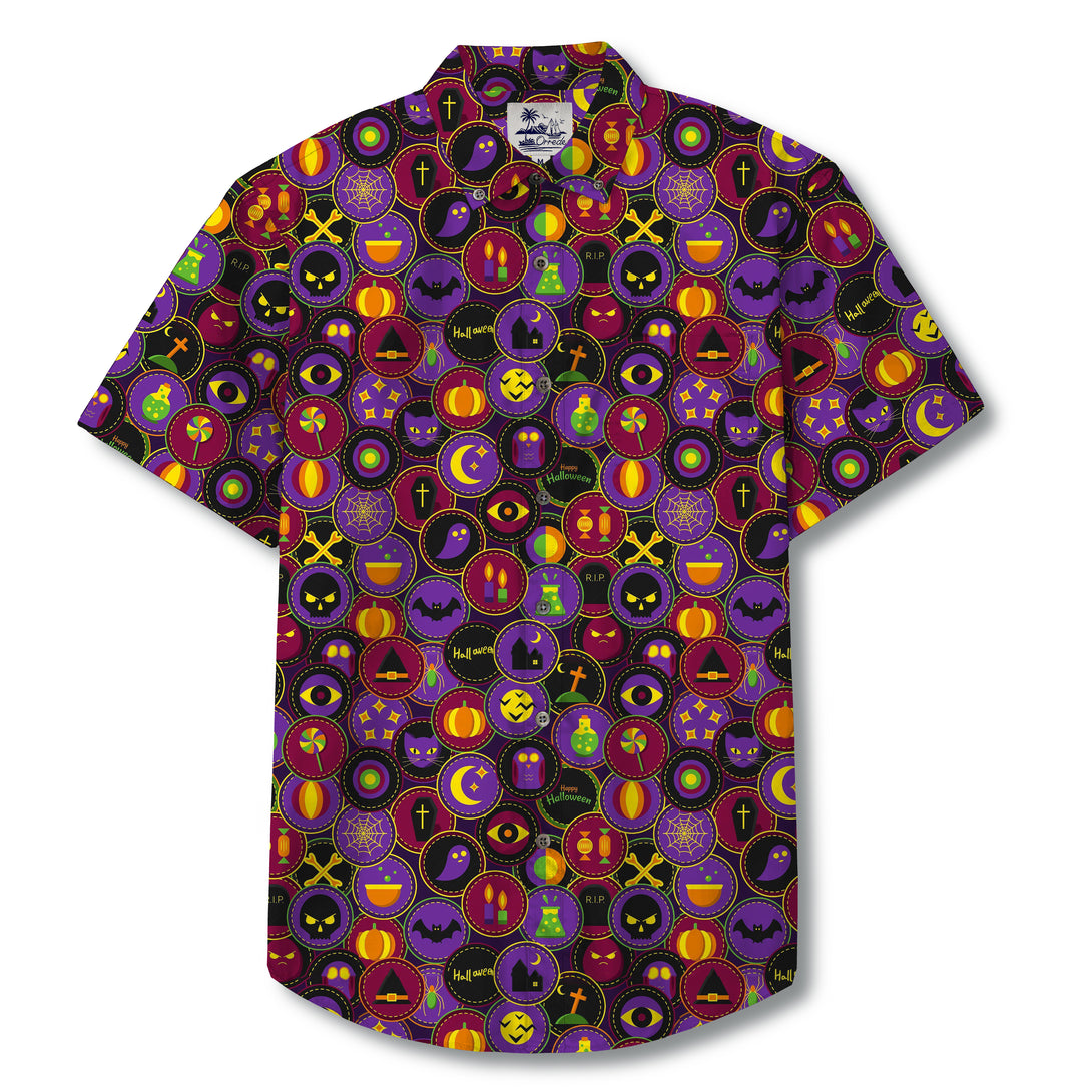 This Halloween-inspired design features a vibrant collection of spooky symbols and festive motifs, all arranged in colorful circular patterns. Pumpkins, ghosts, bats, skulls, crosses, and witches’ cauldrons are scattered across the fabric, intertwined with glowing eyes, tombstones, and potion bottles. A playful mix of purple, orange, green, and black captures the eerie yet fun essence of the holiday. The overall aesthetic is lively, mischievous, and filled with the magic of Halloween night.