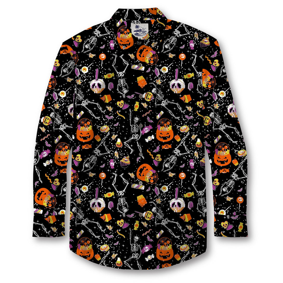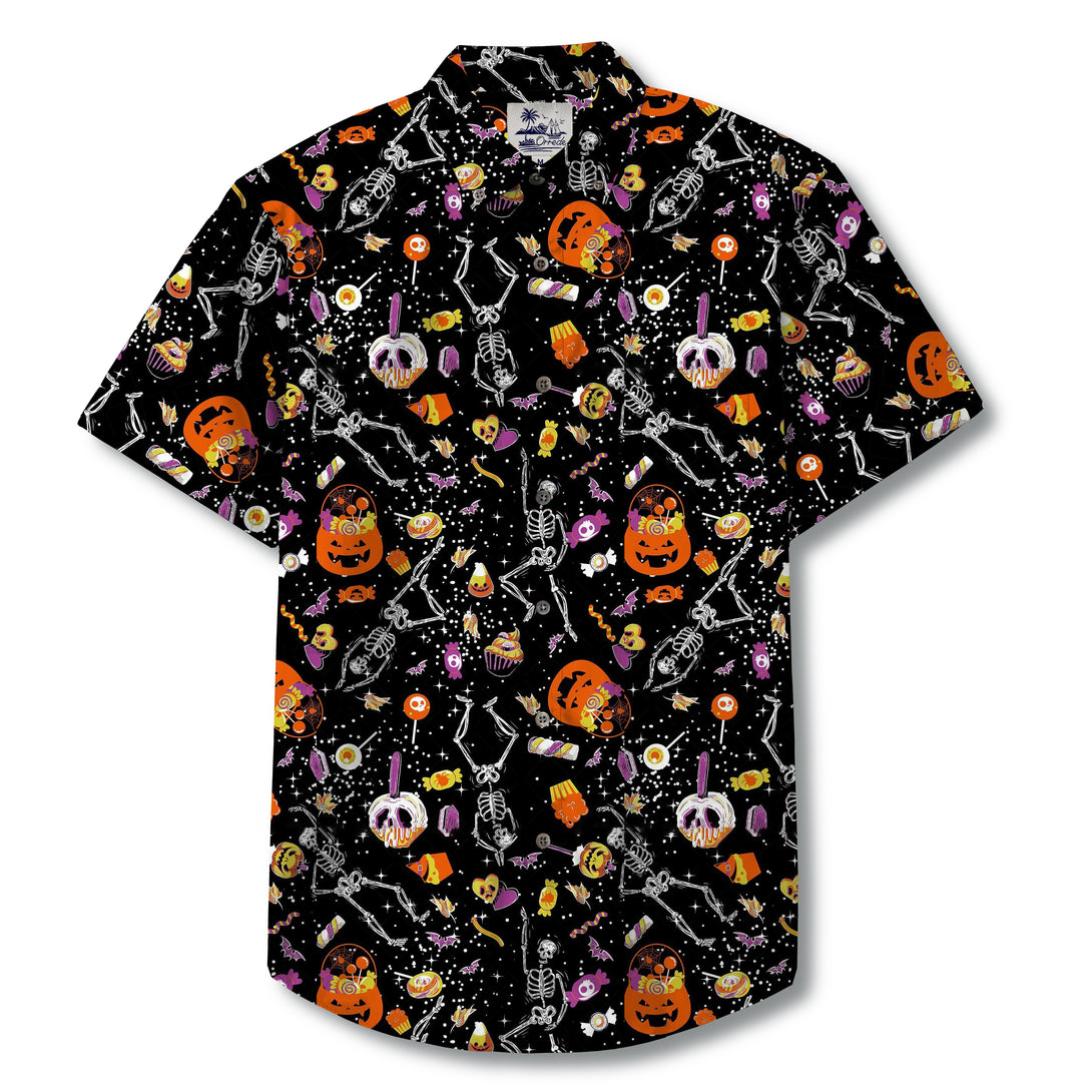 This festive Halloween shirt is filled with a playful, spooky design featuring scattered skeletons, pumpkins, candy, and eerie elements. A vibrant mix of oranges, purples, and blacks sets the tone for a hauntingly fun vibe. The design is a perfect blend of trick-or-treating joy with a touch of mischievous charm, with pumpkins and skeletons interacting with candy and whimsical details like candy corn and witches' hats.