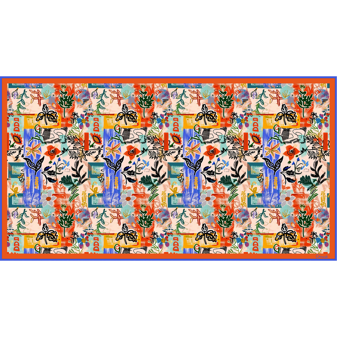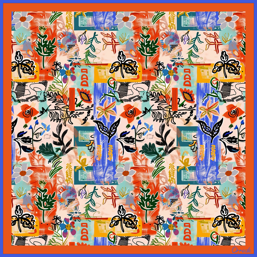 Studio Garden is a lively, painterly collage that fuses modern art with nature’s rhythm. Abstract brushstrokes in burnt orange, vivid blue, lemon yellow, and seafoam green form the backdrop for hand-drawn flora, sketchy butterflies, and playful shapes. The design evokes the spontaneity of an artist’s sketchbook—where imagination blooms freely among real and surreal botanicals.