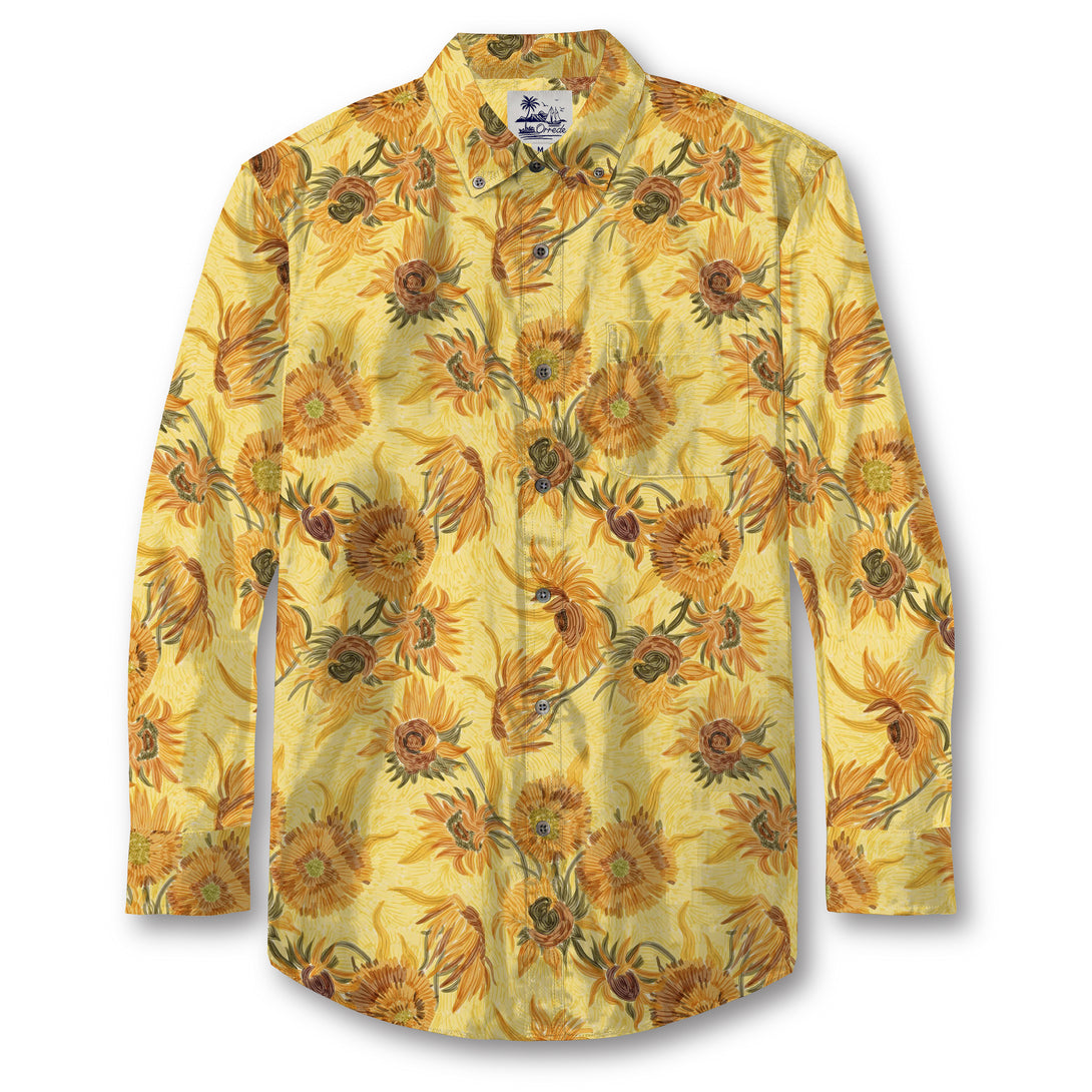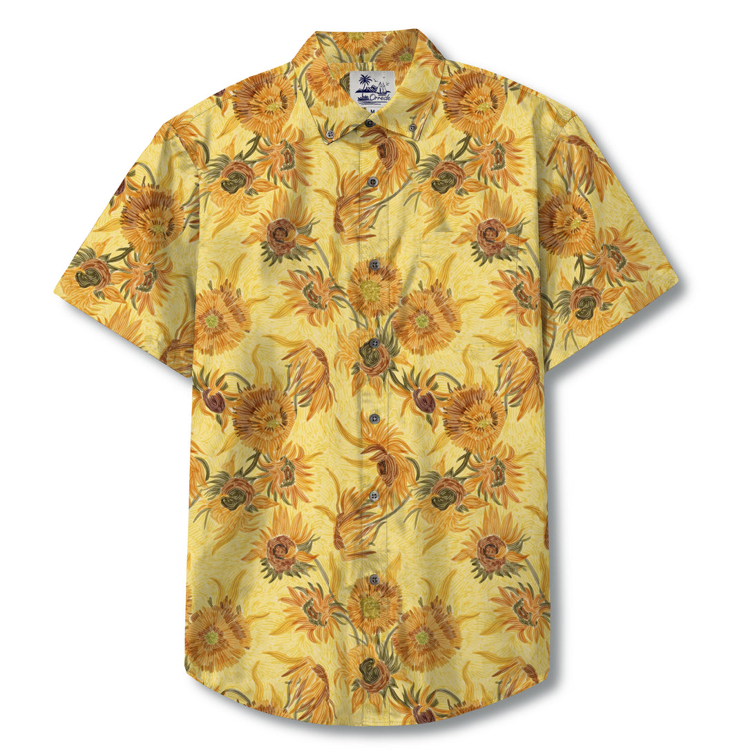 This shirt bursts with the golden warmth of summer fields, featuring a vibrant array of sunflowers rendered in a swirling, painterly style. The dynamic brushstroke-like textures create a sense of movement, as if the flowers are swaying in a sunlit breeze. With rich shades of yellow, orange, and earthy greens, the design blends artistic elegance with tropical charm, making it both lively and timeless.