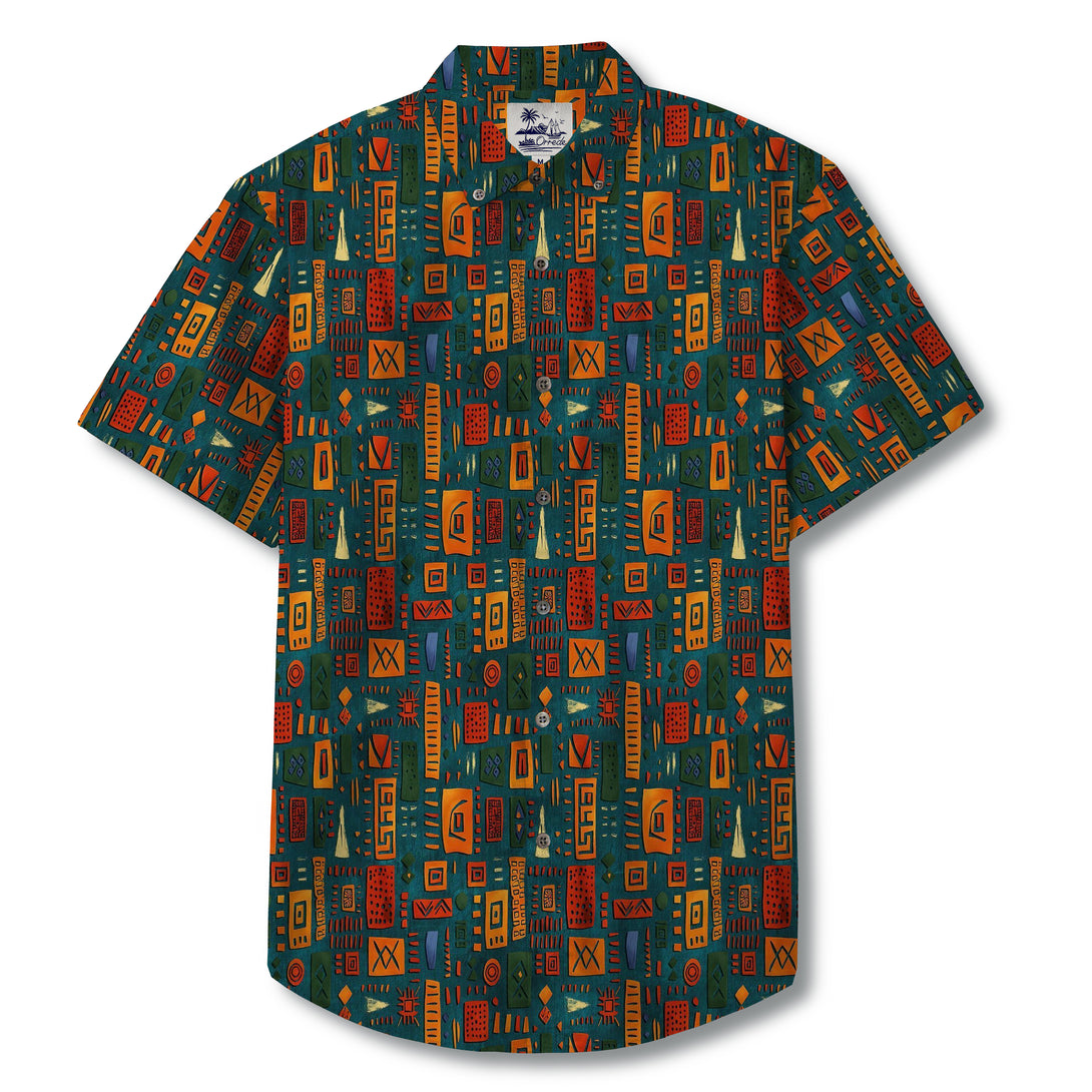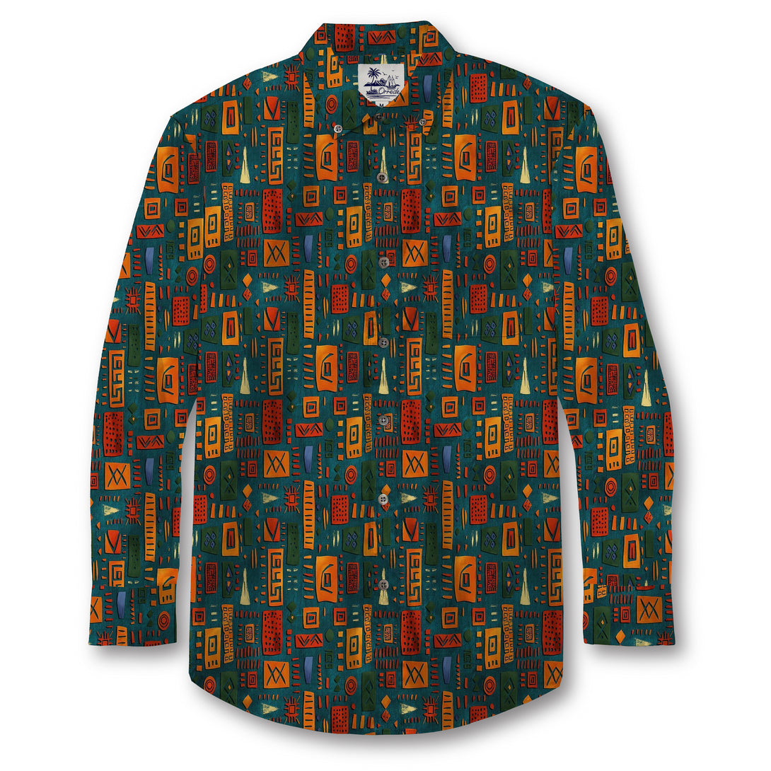 This shirt features a bold, geometric pattern inspired by tribal and mid-century modern motifs. The design is composed of rectangles, spirals, and abstract symbols in warm shades of orange, red, and mustard yellow, contrasted against deep teal and green tones. The repeating blocks create a rhythmic, almost architectural feel, giving the shirt a lively yet sophisticated edge.
