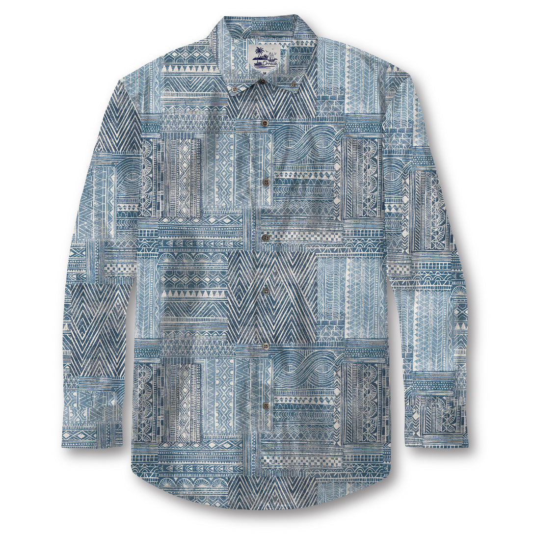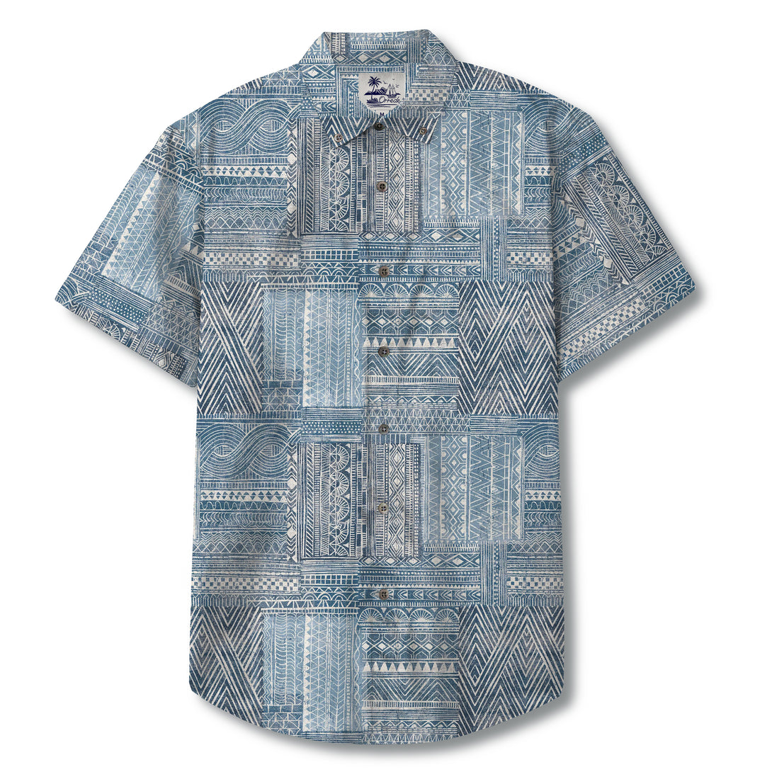 This shirt features a rich mosaic of tribal-inspired geometric motifs arranged in a patchwork style. The pattern combines intricate lines, zigzags, waves, and chevrons, all rendered in a harmonious palette of indigo blue and soft white. Each block tells a story, evoking a sense of cultural heritage, rhythm, and artistic craftsmanship. The design gives a timeless yet modern look, perfect for both laid-back and refined settings.