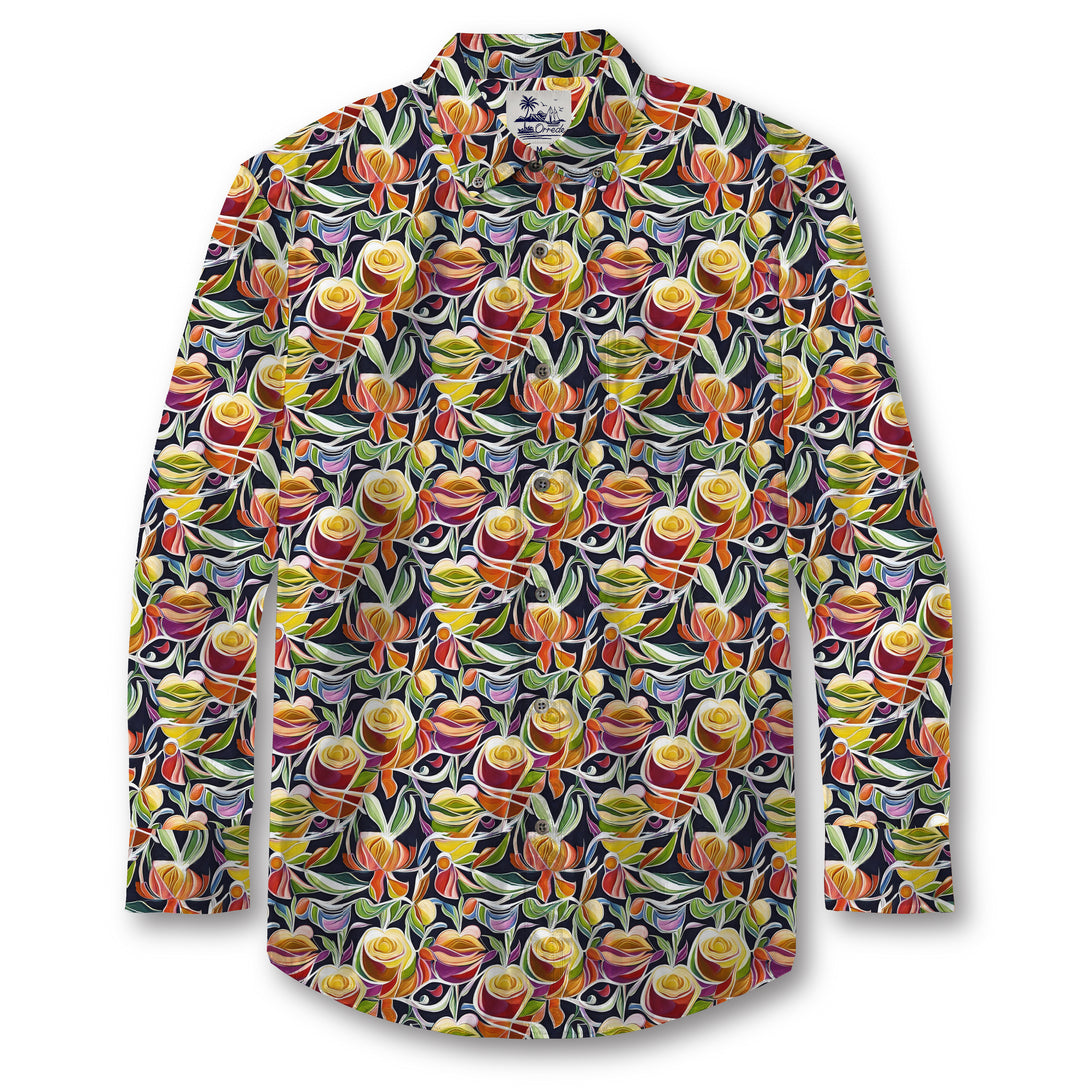 This vivid design bursts with life, featuring an intricate composition of tropical blossoms and lush leaves. The pattern intertwines radiant shades of orange, yellow, red, and green, accented with hints of purple and white to create dynamic depth. The floral forms are stylized with graceful curves and rhythmic repetition, evoking a sense of harmony and movement. Set against a deep background, the vibrant colors seem to dance, celebrating the energy and abundance of tropical nature.