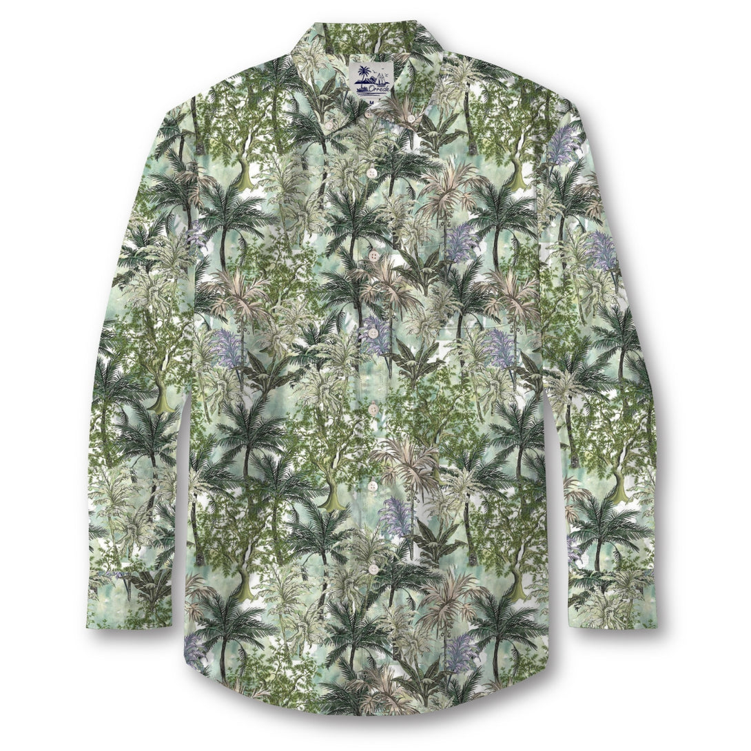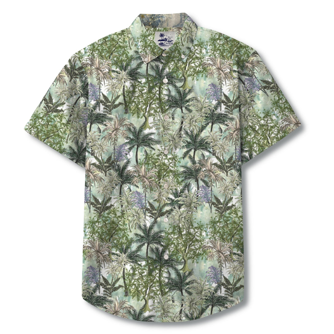 This shirt features a richly layered tropical forest design that captures the untamed beauty of nature. A medley of palms, ferns, and flowering trees intertwine across the fabric in harmonious shades of green, soft beige, and dusky purple. Subtle watercolor-like gradients give depth and atmosphere, evoking the feeling of wandering through a lush, misty jungle at dawn. The overall aesthetic is both serene and wild, blending elegance with the essence of tropical escape.