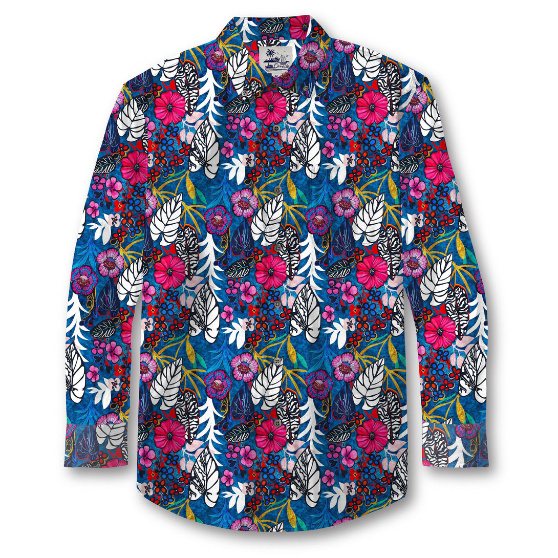 This vivid design bursts with life and rhythm — a tropical symphony of deep blues, radiant pinks, and lush greens. Large hibiscus blossoms intertwine with stylized white and black leaves, while clusters of berries and swirling vines add a sense of motion and harmony. The contrasting colors and layered textures evoke the vibrant energy of island gardens at twilight — exotic, joyful, and endlessly captivating.