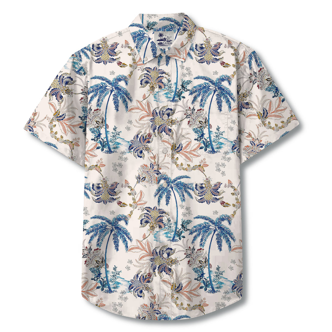 This intricate design captures the serene mystique of a moonlit forest. Layers of foliage in deep blues, forest greens, and soft taupes create a lush, dreamlike woodland scene. Delicate branches, blooming treetops, and hidden undergrowth give the impression of depth and texture, evoking the quiet elegance of nature after dusk. The harmonious palette and painterly style bring a timeless, almost magical atmosphere to this richly detailed shirt.