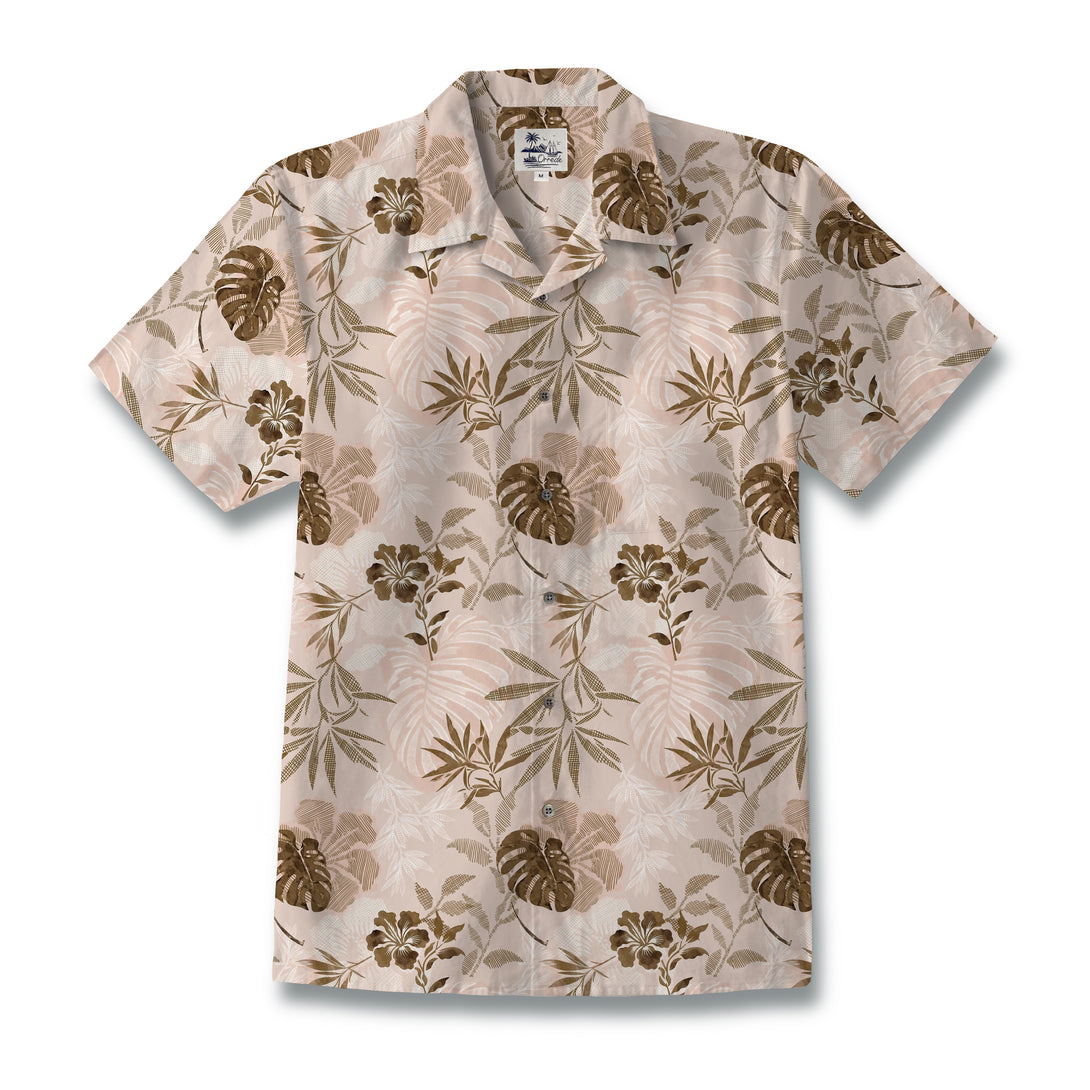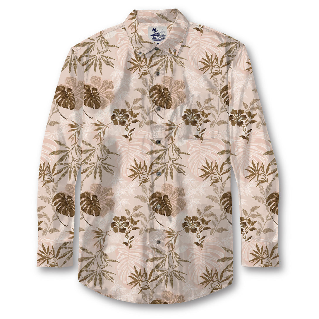 This design blends soft shades of earthy browns and delicate pinks, featuring a mixture of organic shapes like tropical leaves, delicate floral motifs, and textured line patterns. The harmonious balance between solid, flowing forms and intricate geometric lines evokes a sense of serene elegance. The delicate contrast between the natural and the abstract invites a tranquil yet sophisticated ambiance, perfect for those seeking a refined connection with nature.