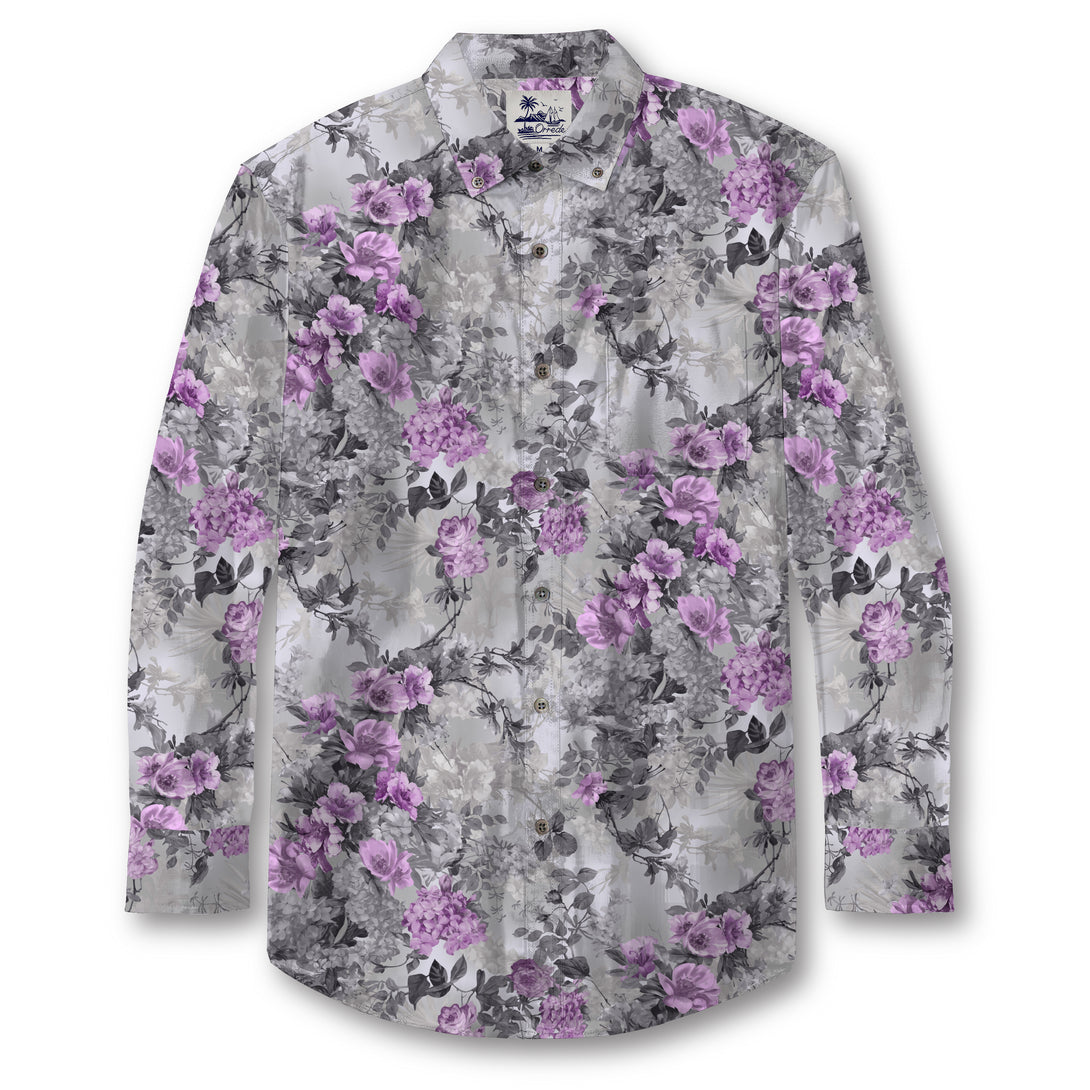 The shirt you’ve shared features a delicate floral pattern with soft shades of purple, lavender, and grayscale. The flowers are densely packed, giving a lush, blooming garden effect. The contrast between the cool tones of gray and the vibrant purple flowers creates a soothing yet striking visual, evoking a sense of elegance and serenity. The design feels romantic and artistic, reminiscent of a peaceful, misty morning garden.