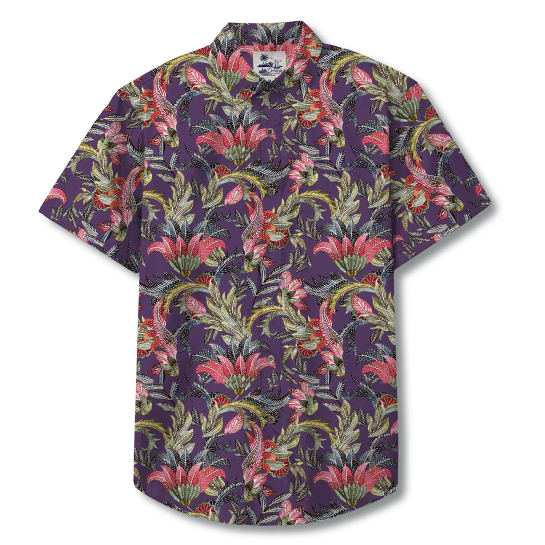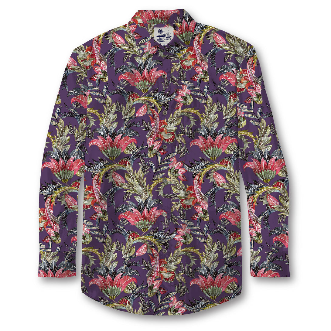 This shirt features an intricate botanical design set against a deep purple backdrop. Lush green foliage intertwines with vibrant pink and red blossoms, their layered petals accented with delicate black and white dotted detailing. The composition creates a lively sense of movement, reminiscent of flourishing tropical gardens under twilight skies. The interplay of bold colors and fine textures gives the shirt a rich, exotic, and sophisticated allure.