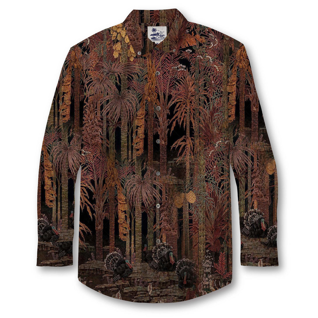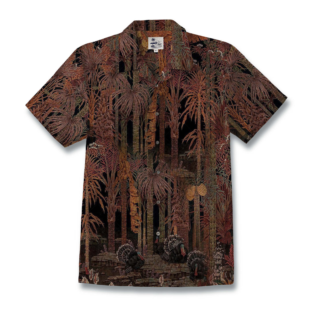 This design captures the mystique of a dense tropical forest at dusk. Towering palm trees and lush foliage in deep shades of rust, bronze, and earthy browns dominate the scene, set against a shadowy black backdrop that evokes the transition from day to night. Hidden among the intricate vegetation are turkeys and smaller woodland creatures, adding a touch of wilderness and discovery. The overall effect is both dramatic and sophisticated, blending natural richness with an air of mystery.