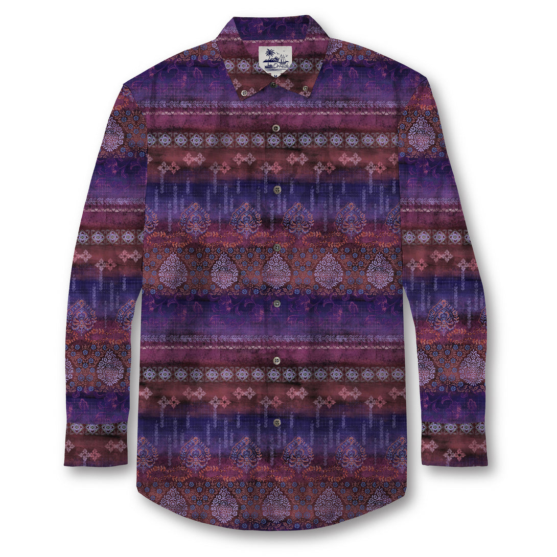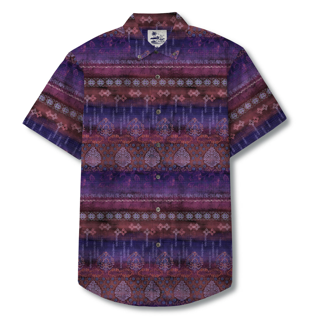 This shirt features a richly layered pattern reminiscent of an intricate woven tapestry. Deep purples and crimson reds dominate the palette, creating a twilight-like atmosphere. Ornamental motifs—including floral arabesques, mandala-inspired circles, and symmetrical paisley forms—flow horizontally in repeating bands. Subtle accents of blue and lavender provide contrast, while faint geometric textures in the background add depth and mystery. The overall design evokes a sense of cultural elegance, with a hint of vintage mystique.