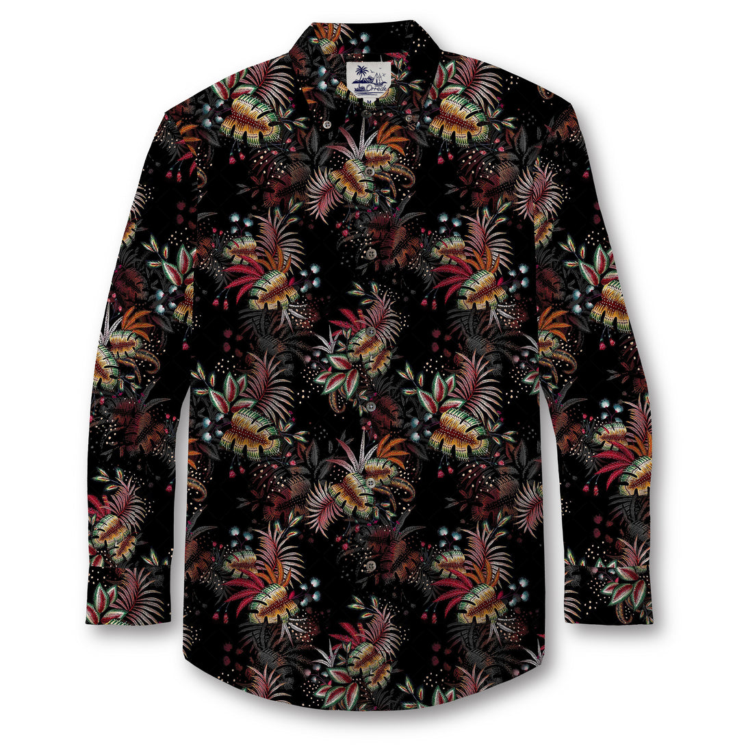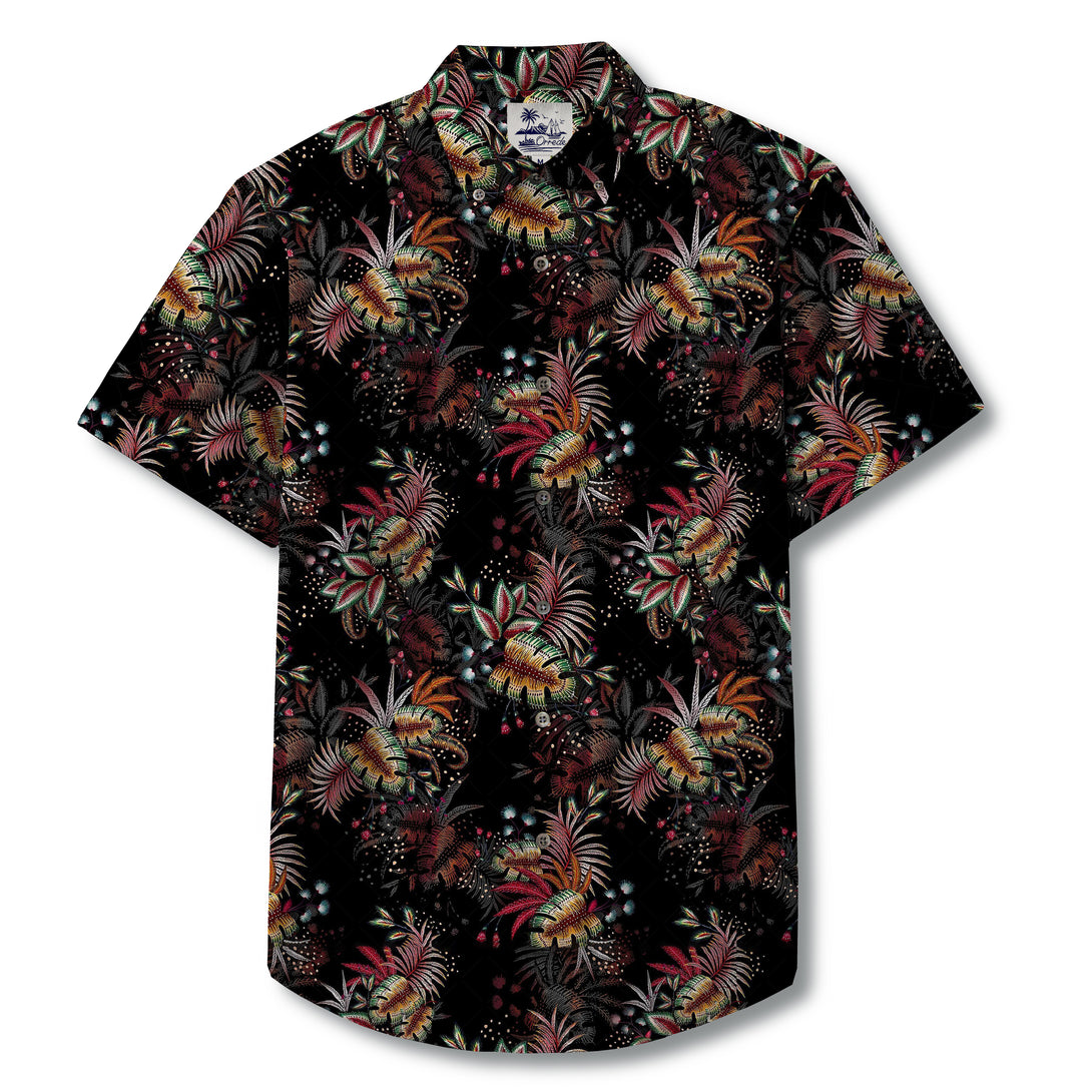 This shirt features a lush tropical design set against a deep black background, evoking the mysterious beauty of a rainforest at night. The pattern showcases an array of exotic foliage in rich, moody hues — deep reds, golden yellows, soft teals, and earthy browns — interwoven with delicate dots and shadows that resemble glowing fireflies or falling embers. Pineapple-like elements and stylized leaves give the shirt an organic, yet otherworldly touch, creating a sense of nighttime adventure under the stars.