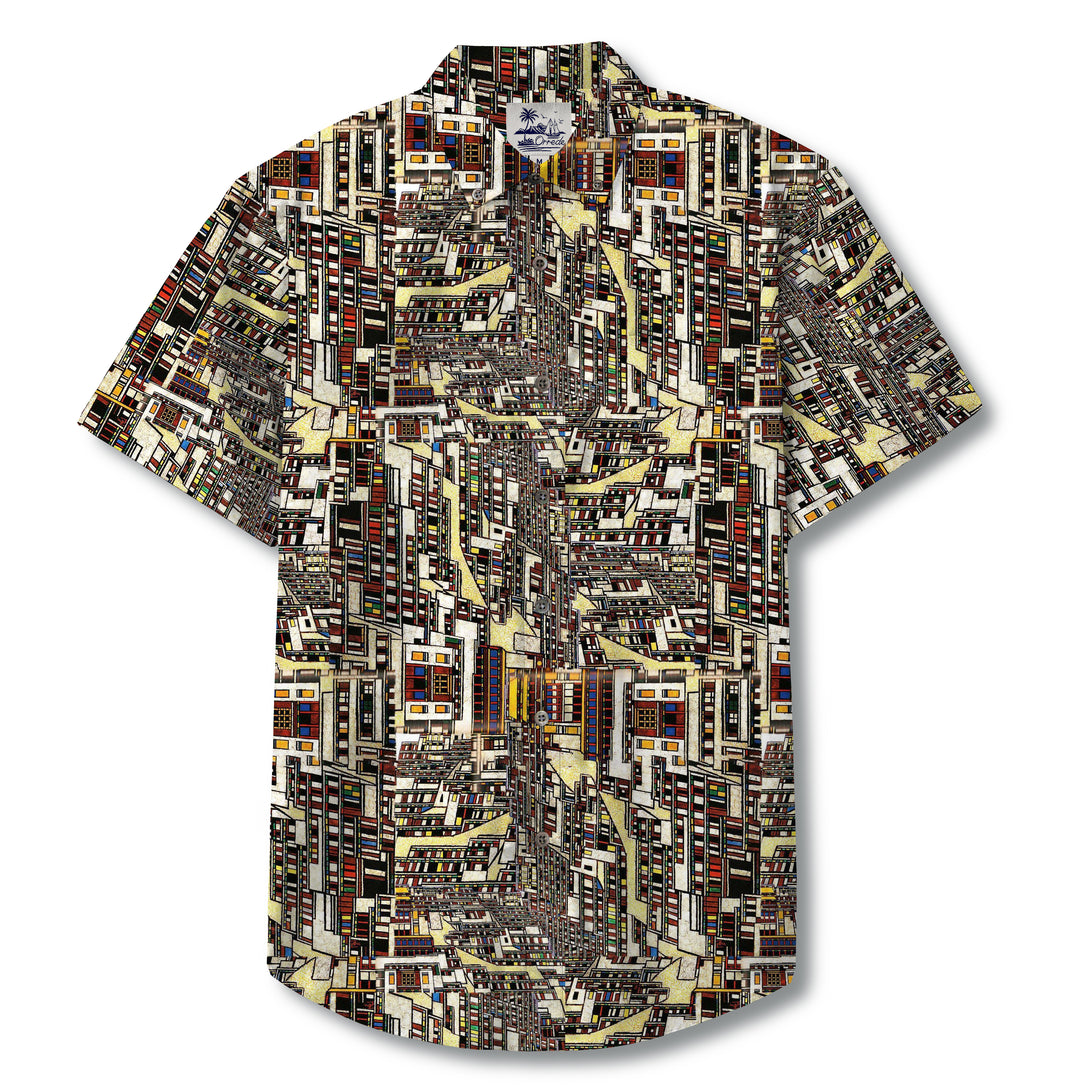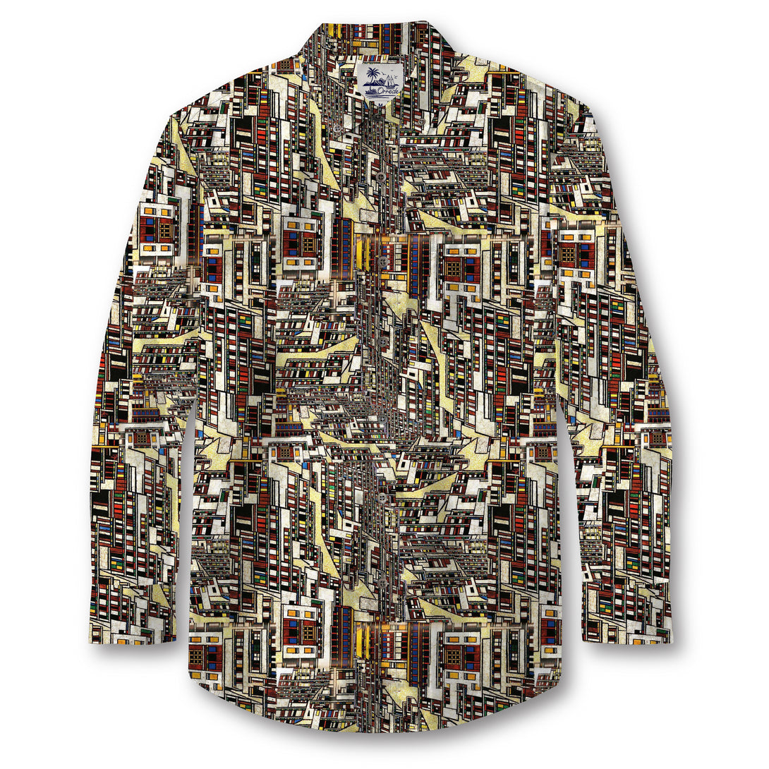 This striking design features a labyrinth of geometric cityscapes, with towering facades, interwoven windows, and abstracted architectural details. The repeating blocks of color—reds, yellows, greens, and blacks—create a rhythmic, almost kaleidoscopic effect, reminiscent of a dense urban jungle. The overlapping lines and stacked structures evoke both the chaos and beauty of modern metropolises, turning the shirt into a wearable cityscape.