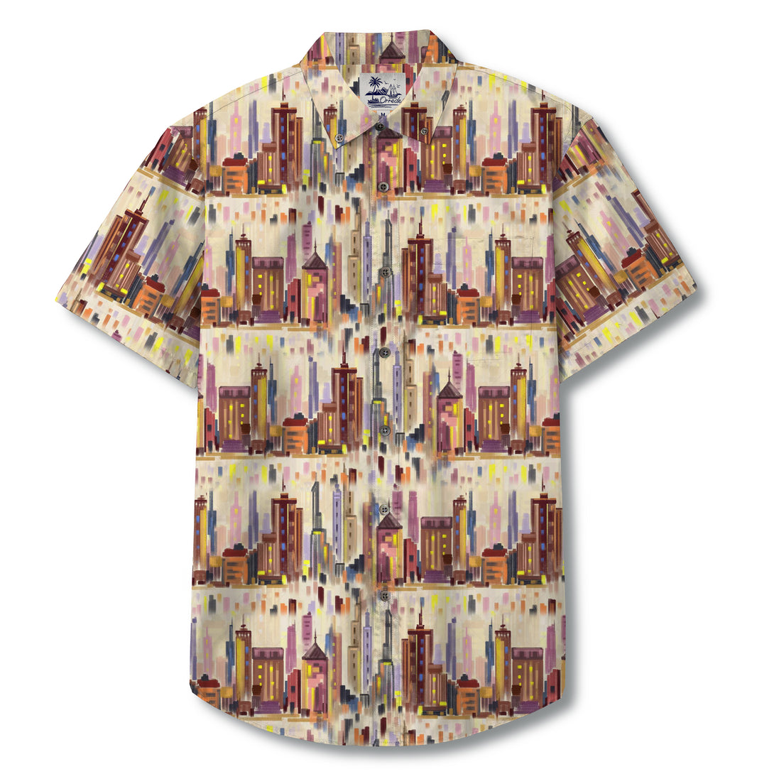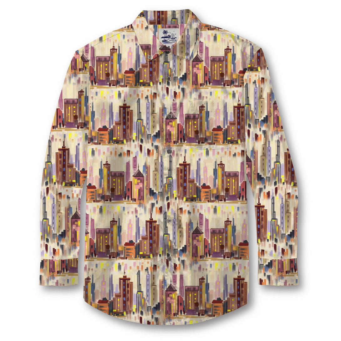 This shirt features a vibrant cityscape design with abstract, hand-painted skyscrapers in warm tones of burgundy, orange, pink, and mustard, accented by cool hints of blue and purple. The repeating blocks of buildings create a rhythmic, geometric feel, while the softly blurred background adds depth and movement, evoking the atmosphere of an illuminated metropolis at dusk. The mix of vertical lines and scattered color strokes gives the pattern an artistic, almost impressionistic style.
