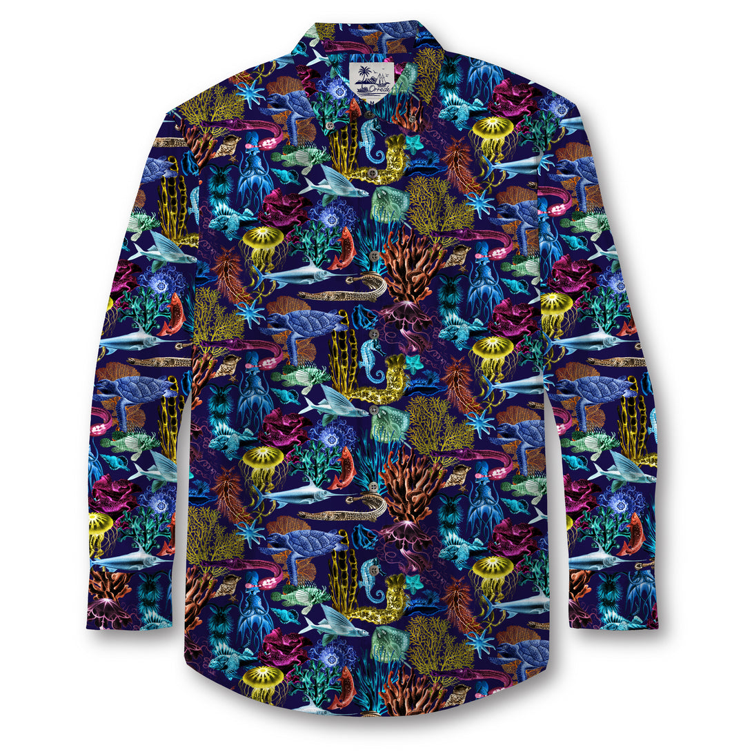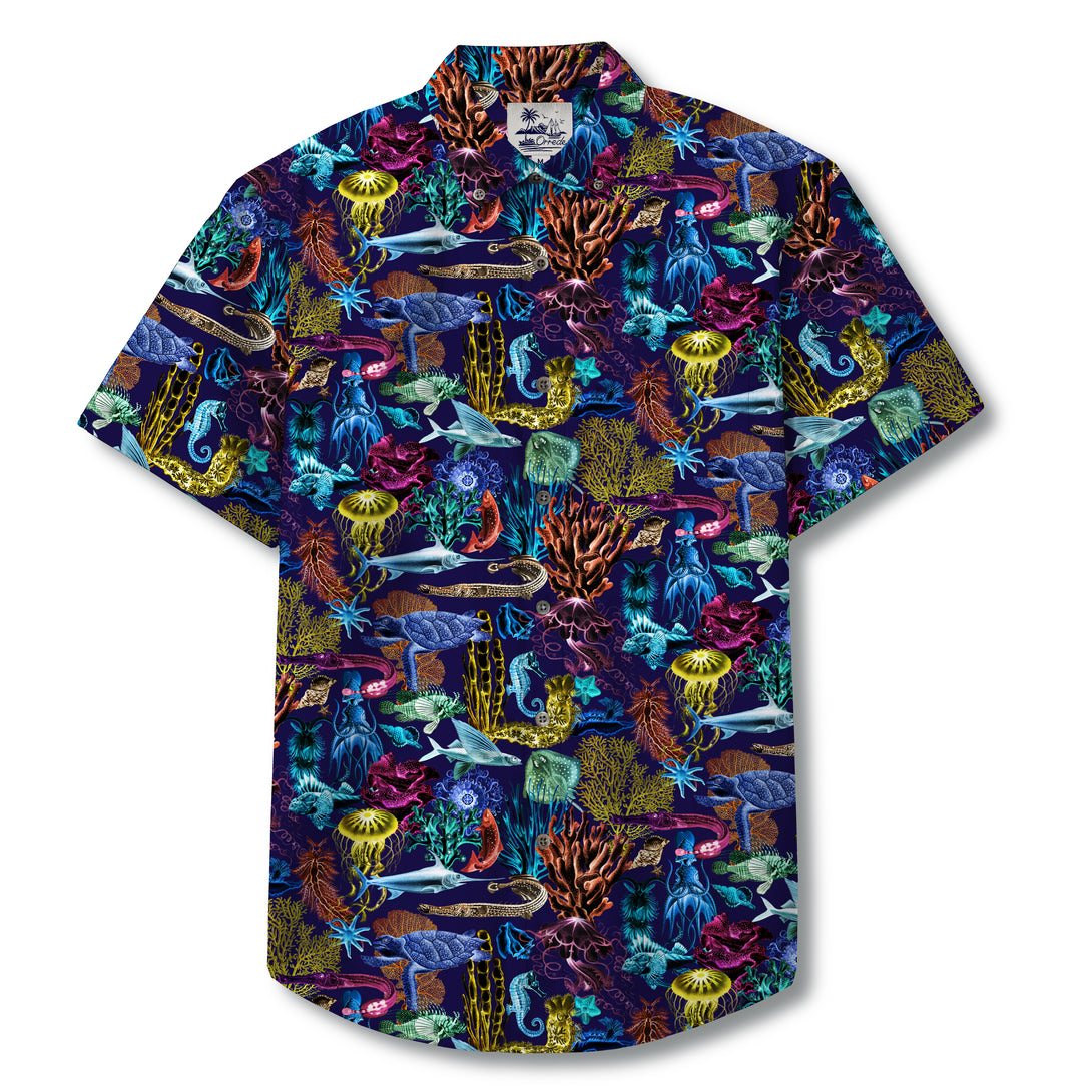 This vibrant shirt features an intricate underwater scene inspired by the depths of a coral reef at night. The design showcases a rich tapestry of marine life, including seahorses, whales, jellyfish, coral formations, and various tropical fish. The use of vivid neon hues—electric blues, bright yellows, deep purples, and fiery oranges—against a dark navy background gives the shirt a glowing, bioluminescent effect. The detailed illustrations bring out a sense of movement and mystery, capturing the lively yet serene essence of an oceanic paradise after dusk.