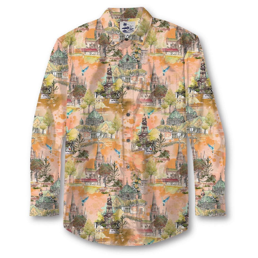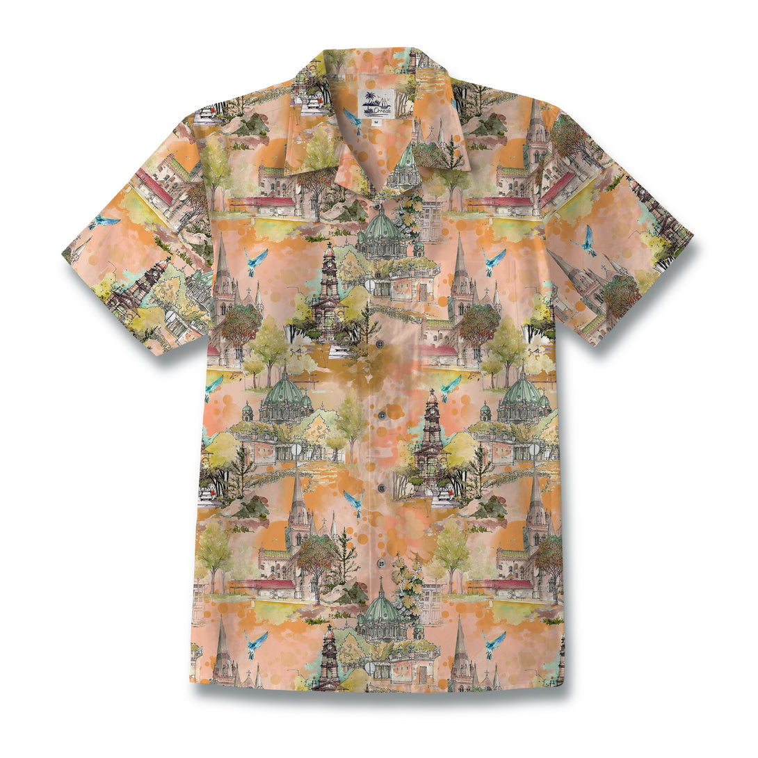This design features a picturesque collage of hand-drawn architectural landmarks, domes, spires, and pagodas, set against a warm watercolor-style background in shades of peach, orange, and soft green. Interspersed with leafy trees and delicate blue birds, the pattern creates a dreamy, storybook atmosphere that blends European and Asian influences. The artistic sketch effect gives it a vintage travel diary charm, while the watercolor splashes add a modern, artistic vibrance.
