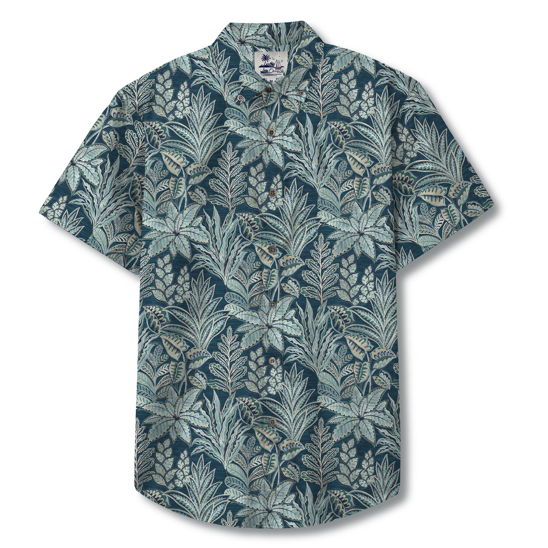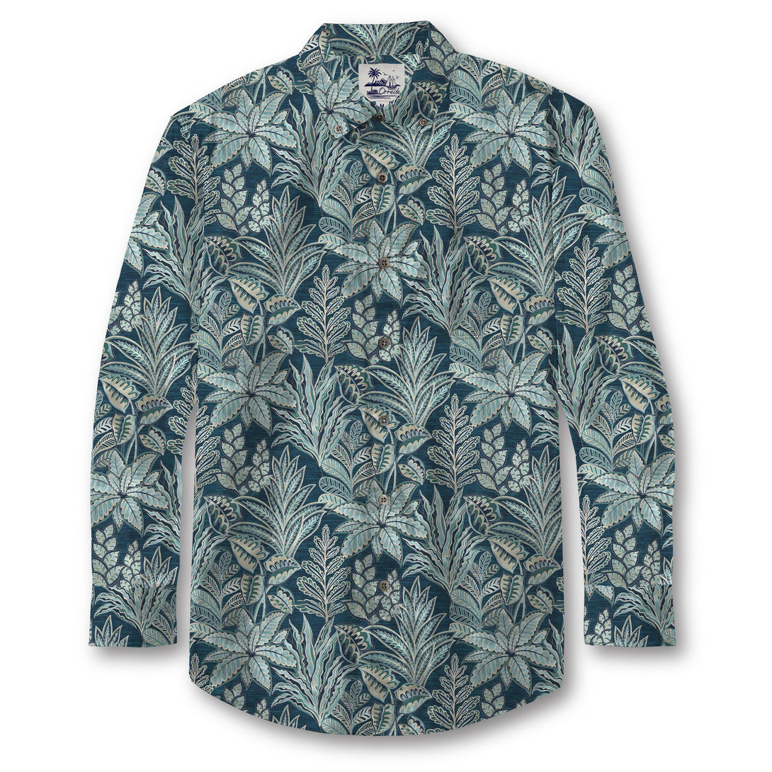 This shirt features a rich, tropical foliage pattern set against a deep teal background. The design consists of various layered botanical elements, including palm fronds, ferns, and broad tropical leaves in shades of muted green, beige, and off-white. The intricate detailing gives the shirt a textured, almost hand-drawn look, evoking a lush jungle atmosphere. The overall aesthetic is both vintage and elegant, making it ideal for relaxed, stylish occasions.