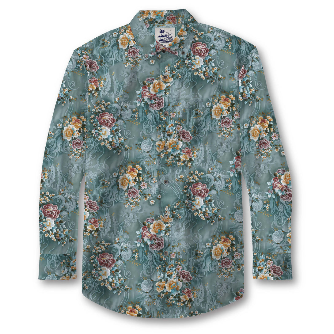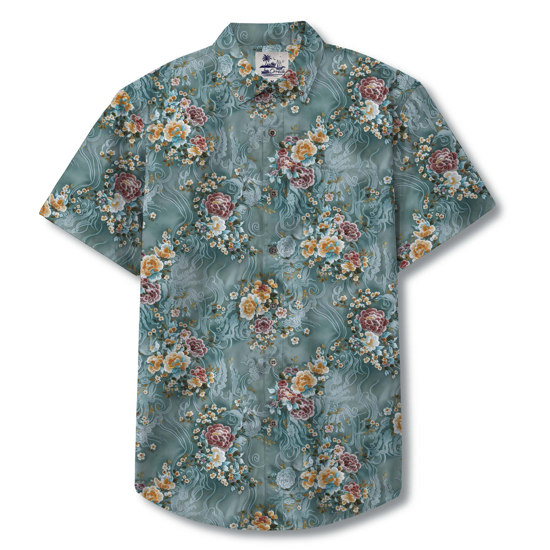 This shirt features an elegant floral design set against a muted jade-green background. Flowing, wave-like lines create a sense of graceful movement, reminiscent of silk embroidery or traditional Asian textile art. Clusters of blooming peonies and delicate blossoms in shades of gold, maroon, ivory, and teal scatter across the fabric, giving it a refined yet lively composition. The interplay of swirling motifs and layered flowers evokes both vintage charm and timeless sophistication.